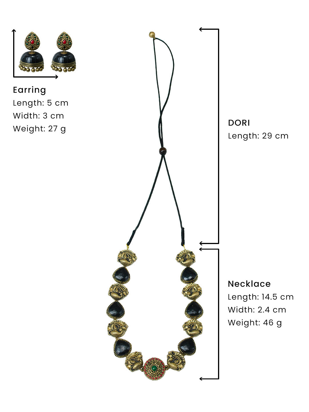 Antique Gold Black Red Green Peacock Tear Drop Shape Design Minimalistic Handmade Terracotta Necklace Set