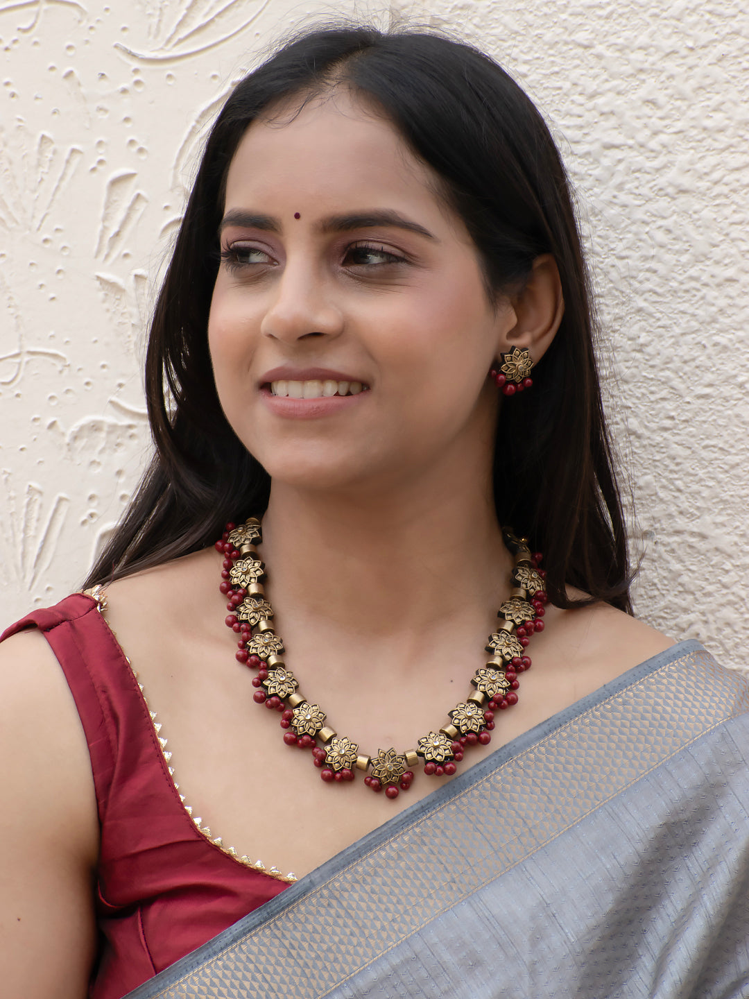 Kundanjali — Antique Gold Floral Tube Design Maroon Kundan Stone Handmade Terracotta Necklace Set