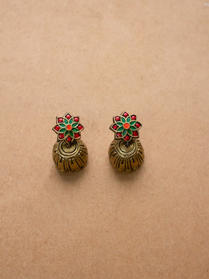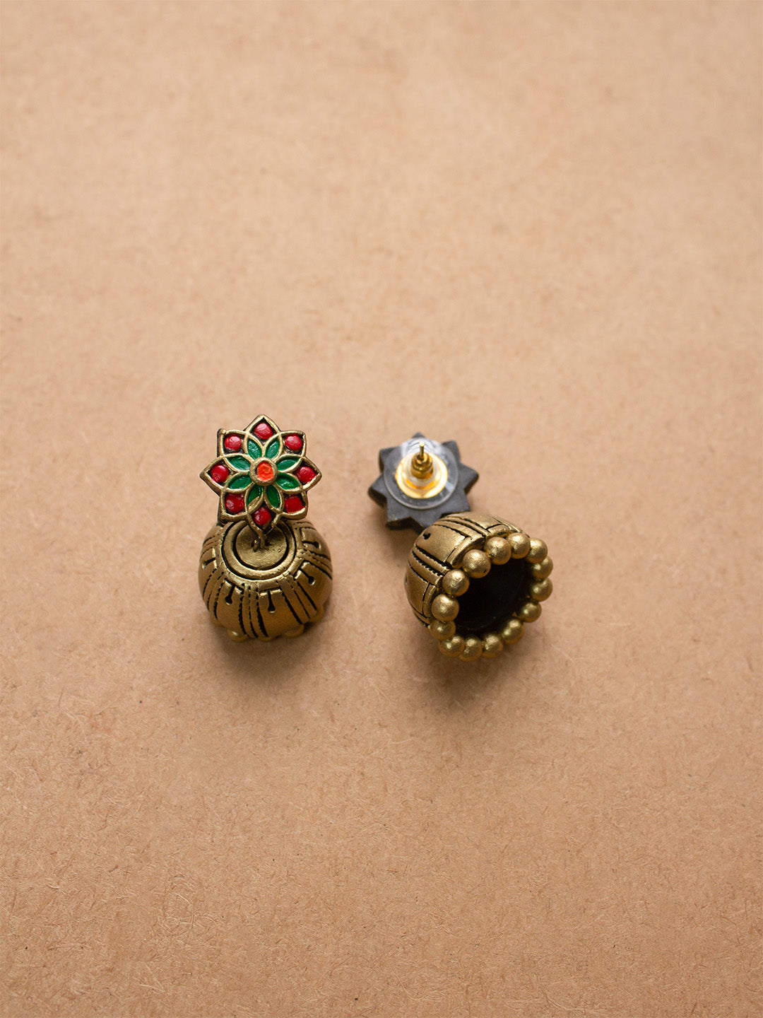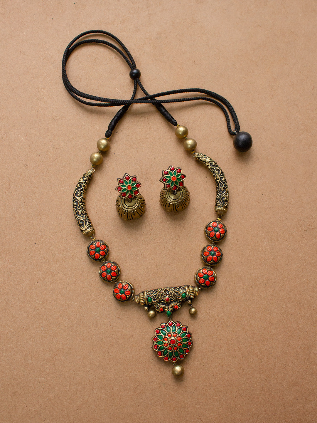 Varshika — Antique Gold Green Orange and Red Flower Design Handmade Terracotta Necklace Set