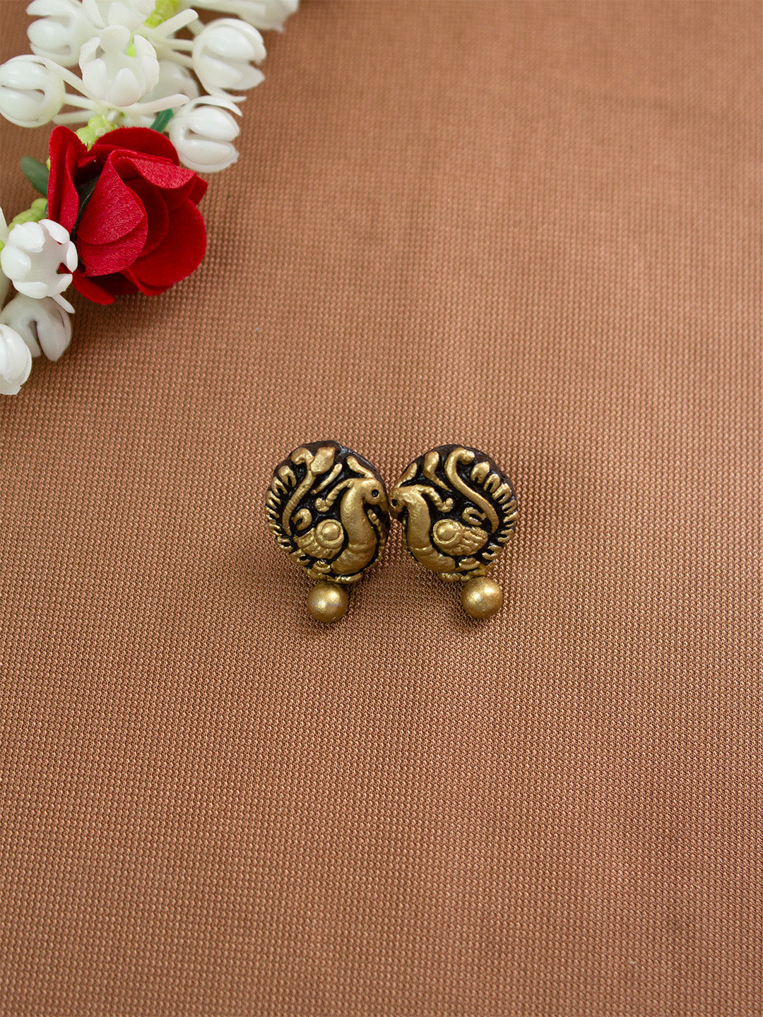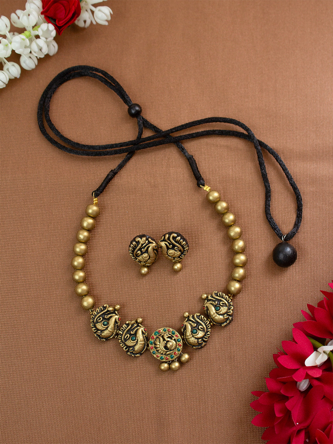 Antique Gold Red and Green Peacock Design Handmade Terracotta Necklace Set