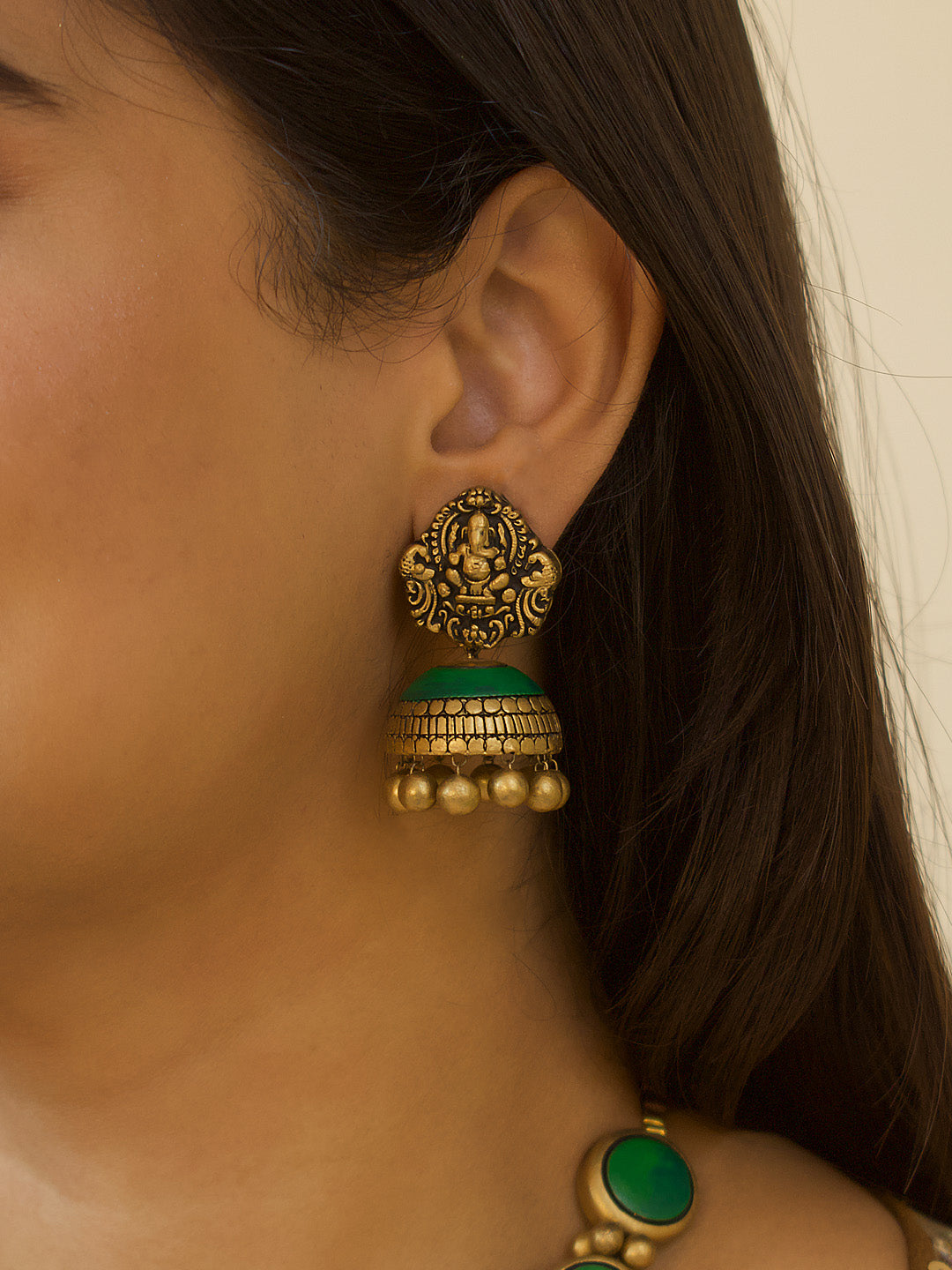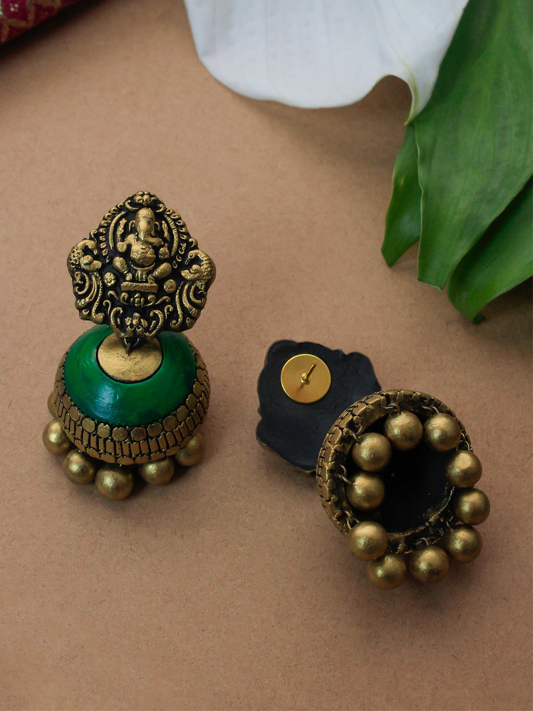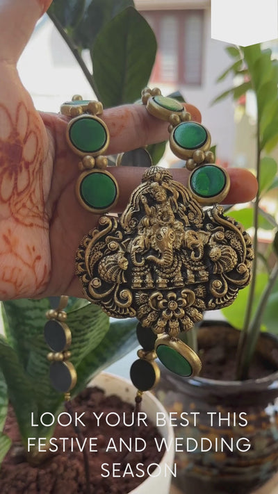 Ganesha Mandala — Green and Antique Gold Circular Pattern Ganesha Pendant Design Temple Long Handmade Terracotta Necklace Set