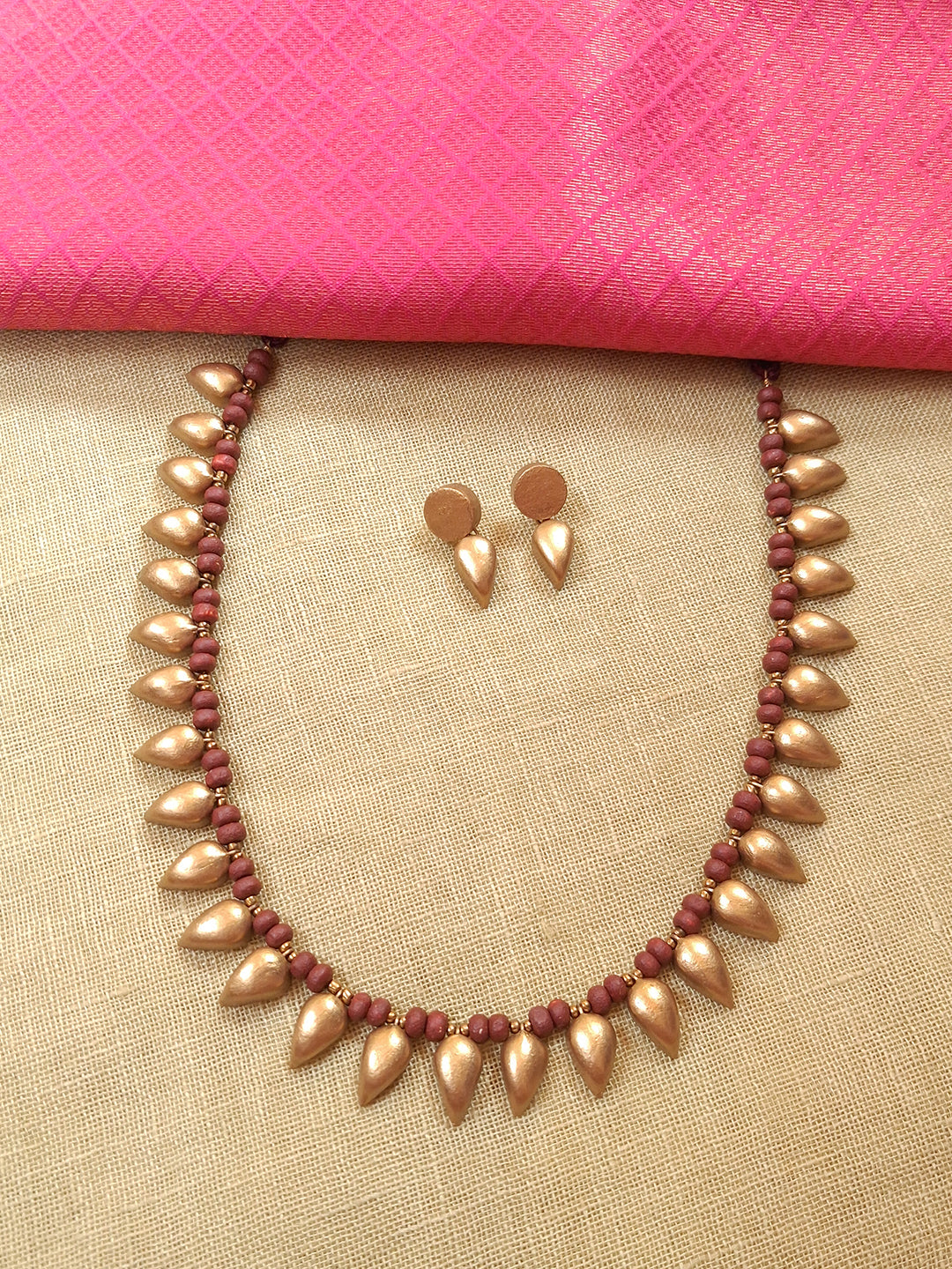 Bindurekha – Handmade Terracotta Teardrop Necklace Set in Gold with Maroon Beads