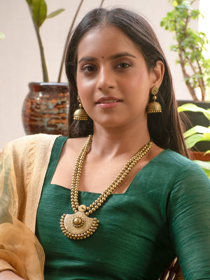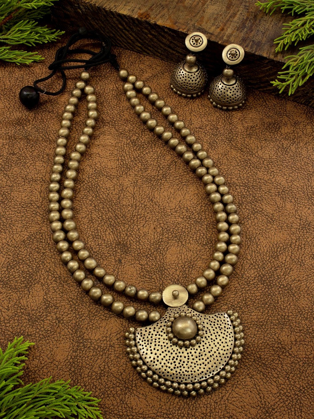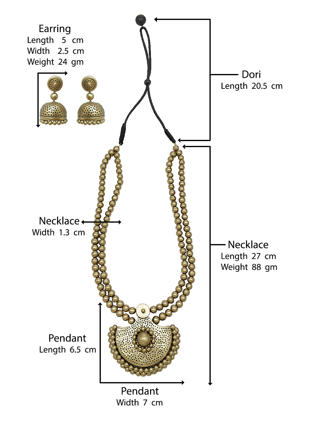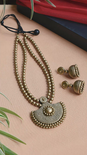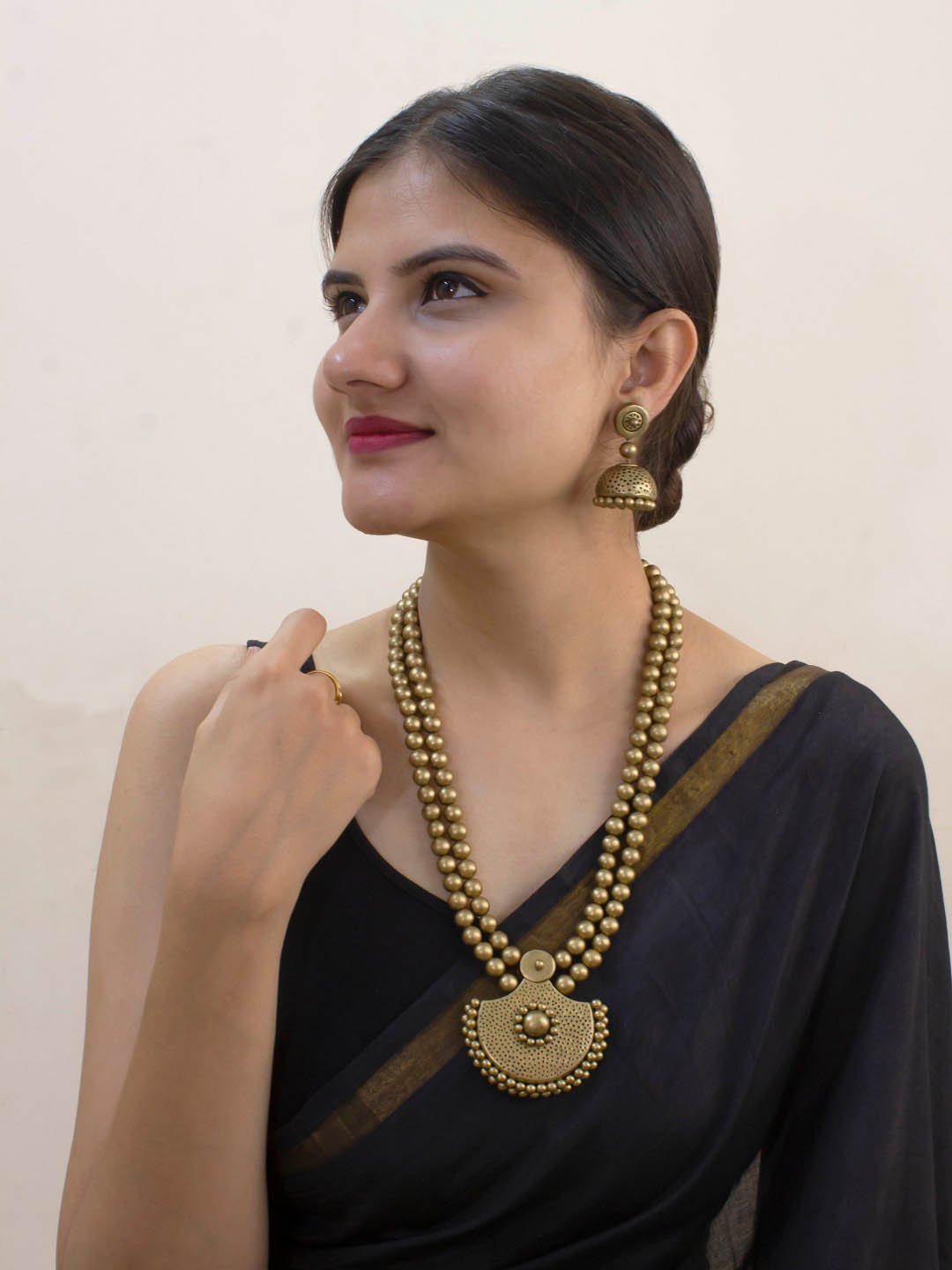 Chandramukhi — Designer Handmade Halfmoon Design Pendant Two Layered Antique Gold Color Terracotta Necklace Set - Kantara