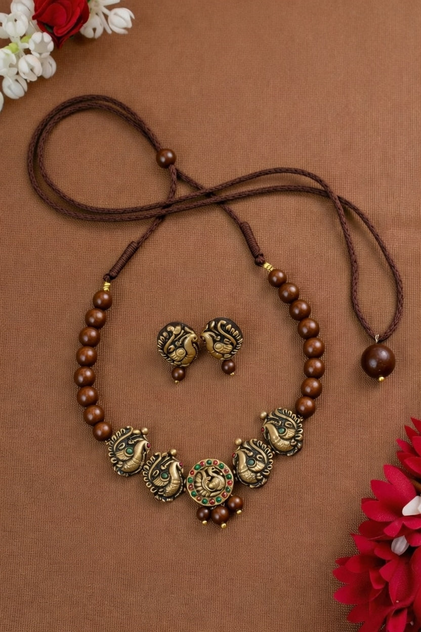 ChocoTaos 🤎 — Antique Gold / Chocolate Brown Beaded Peacock Motifs Choker Set