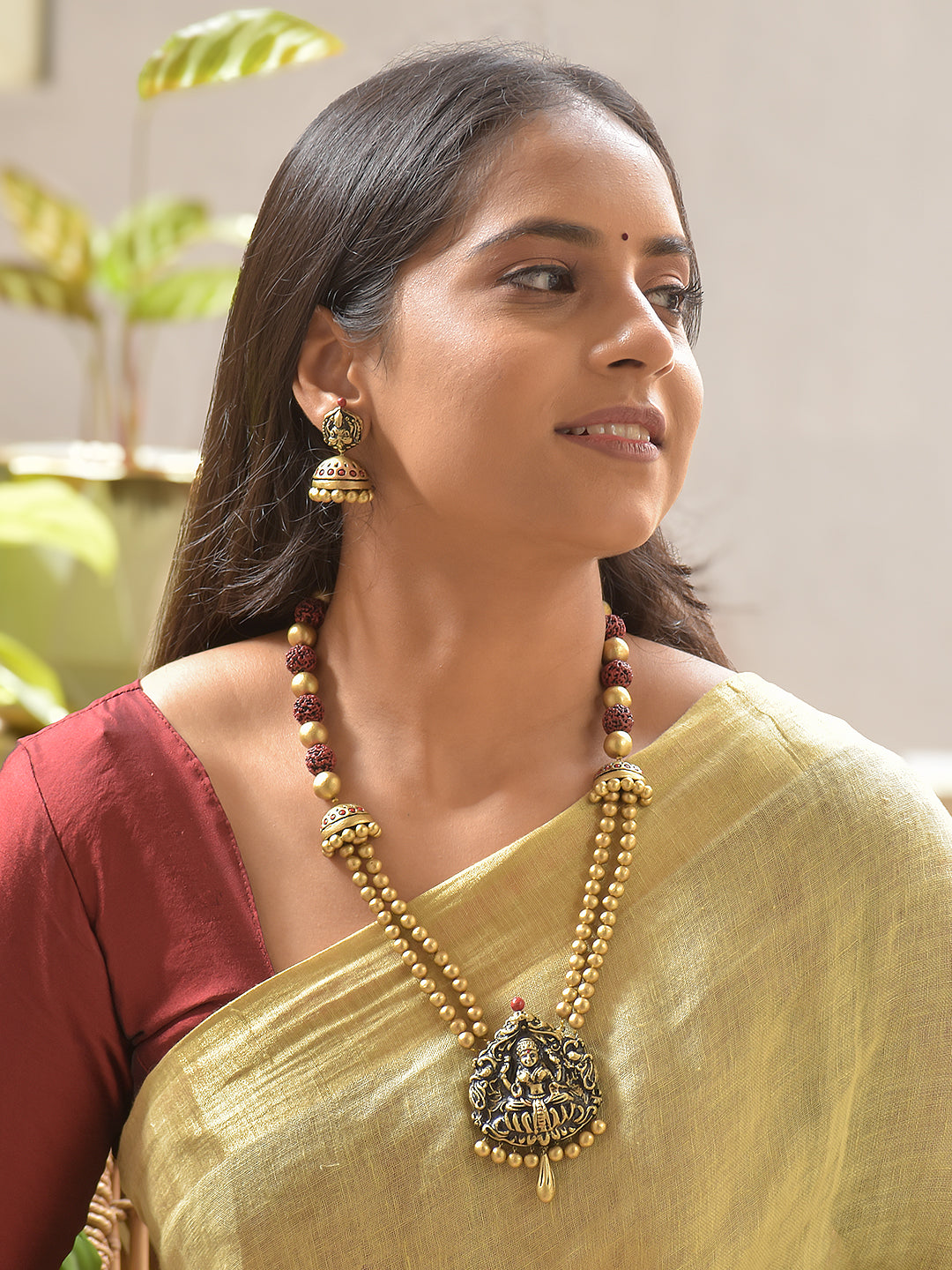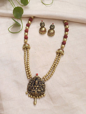 Rudralakshmi - Devi Lakshmi Antique Gold Rudraksha Beads Terracotta Temple Necklace Set with Matching Earrings