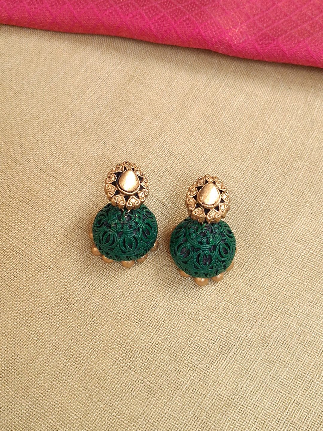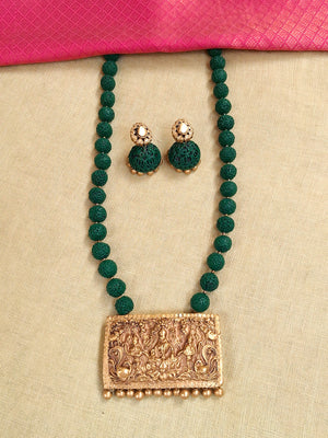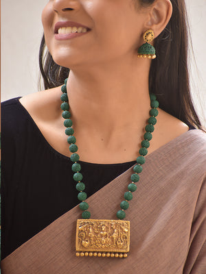 Divyakriti – Handmade Terracotta Temple Pendant Necklace Set with Green Textured Beads and Antique Engraved Jhumka Earrings