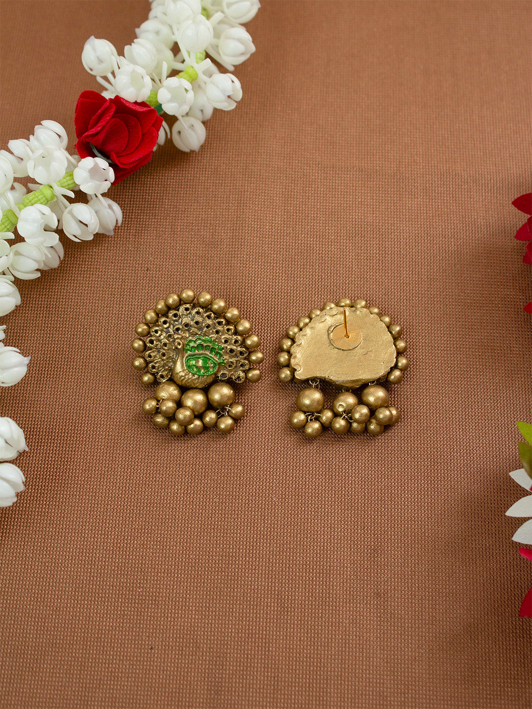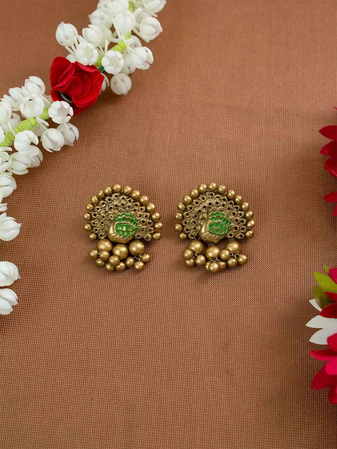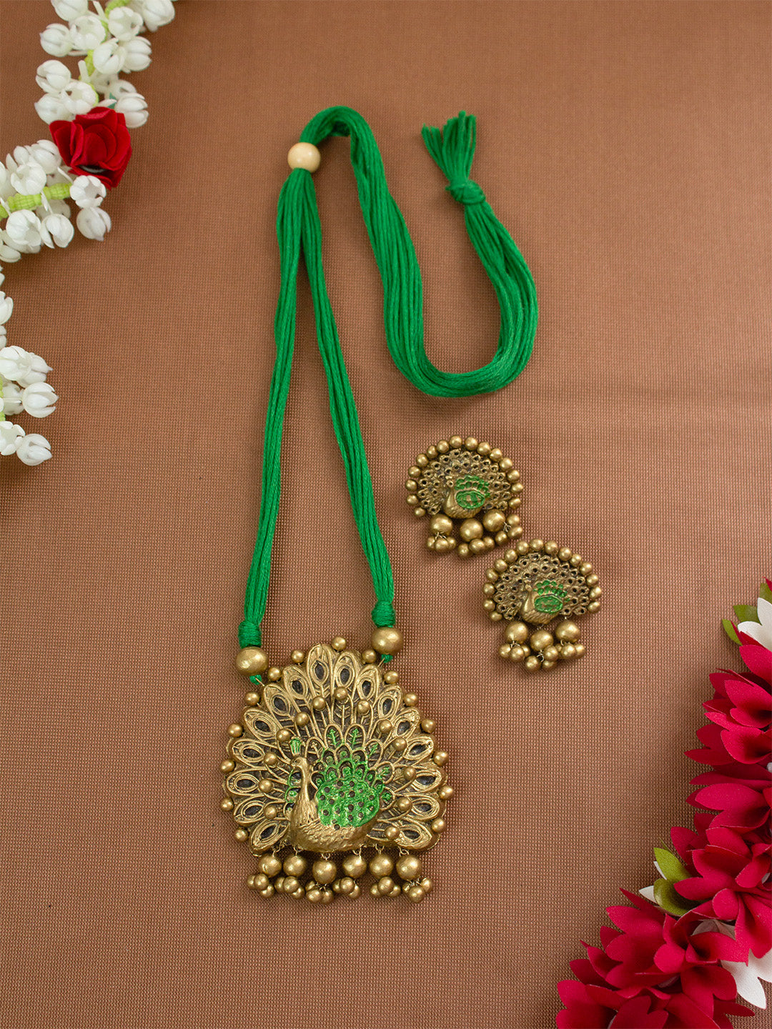 Gold and Green Peacock Design Handmade Terracotta Necklace Set
