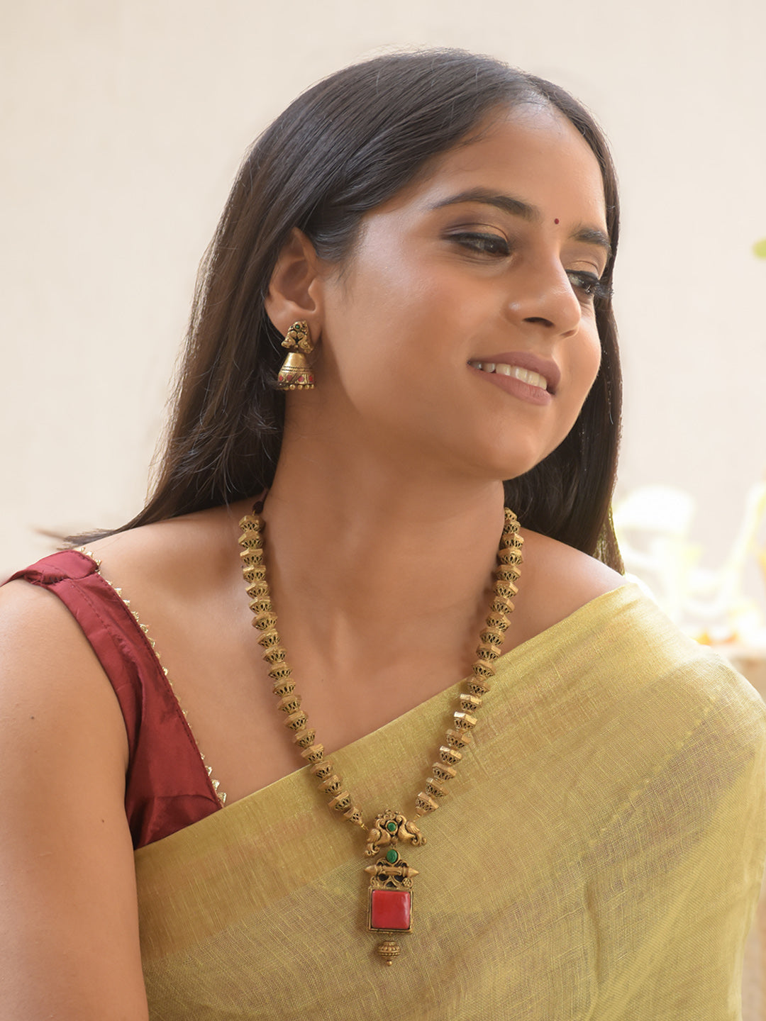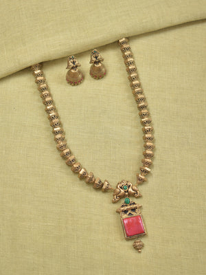 Peacoria - Handcrafted Antique Geometric Bead Terracotta Necklace Set with Red-Green Stone Pendant and Peacock Motif Earrings