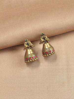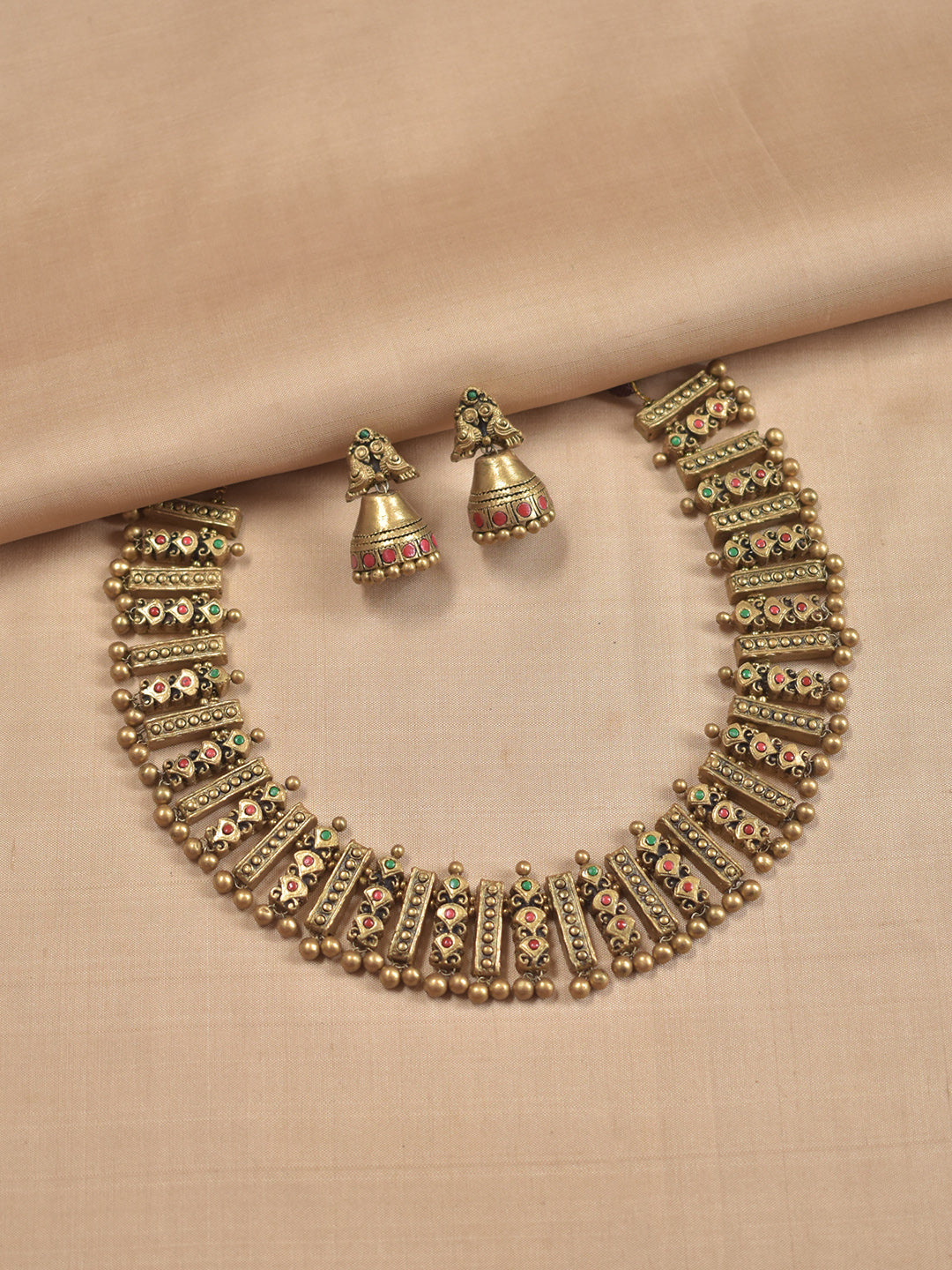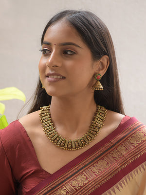 Chakrika - Handcrafted Antique Gold Step-Panel Terracotta Necklace Set with Red-Green Stone Detailing and Bold Earrings