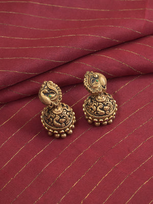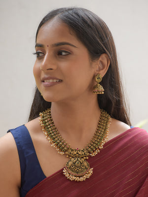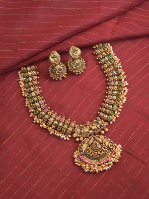Mayuraja - Handcrafted Antique Peacock Motif Terracotta Necklace Set with Kemp Stones in Red Green and Pearl Fringe Design and Matching Earrings