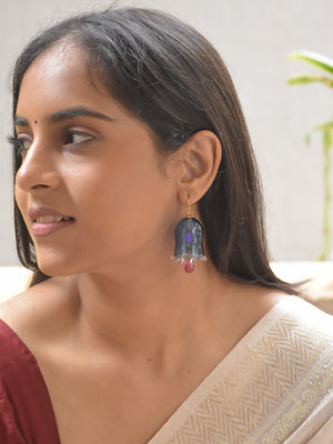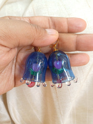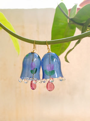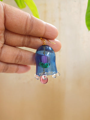 Handcrafted Blue Glass Bell-Shaped Floral Earrings with Bead Drops