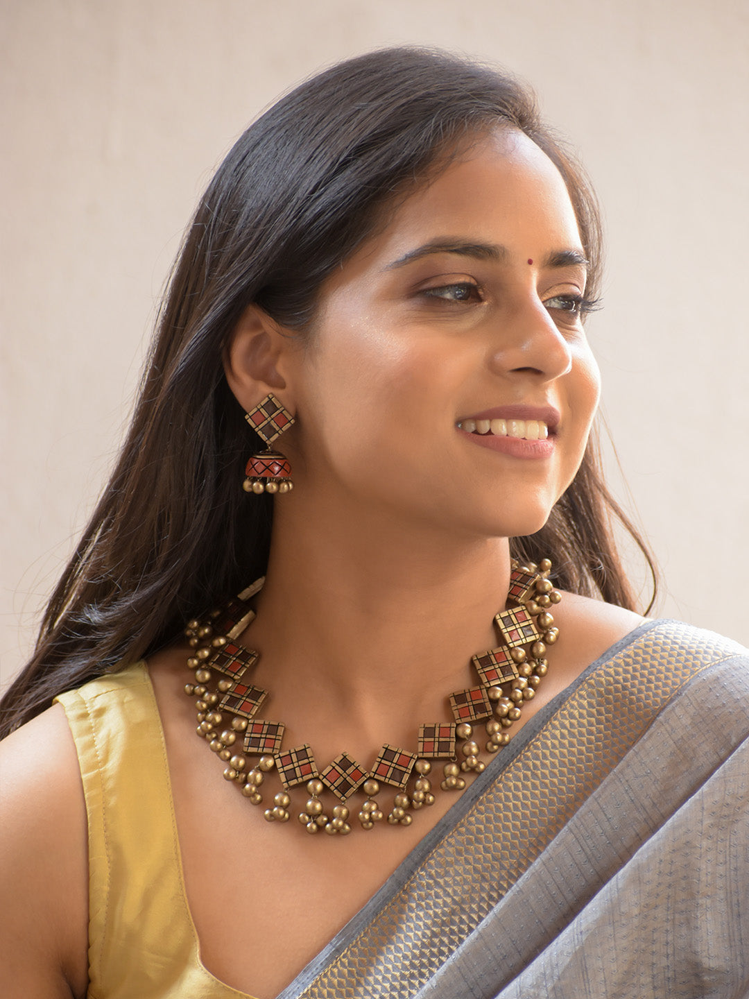 Handcrafted Geometric Terracotta Jewellery Set in Red, Brown and Antique Gold Finish