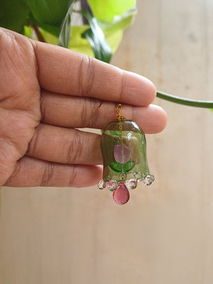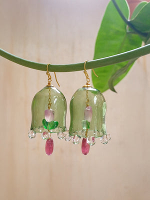 Handcrafted Green Glass Bell-Shaped Floral Earrings with Bead Drops