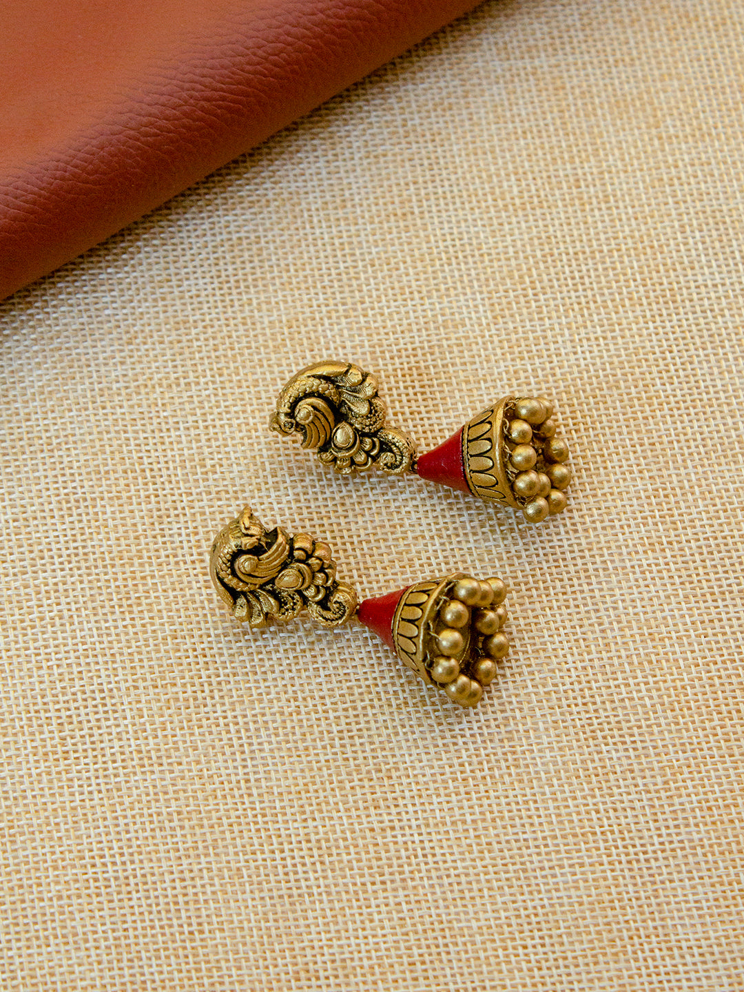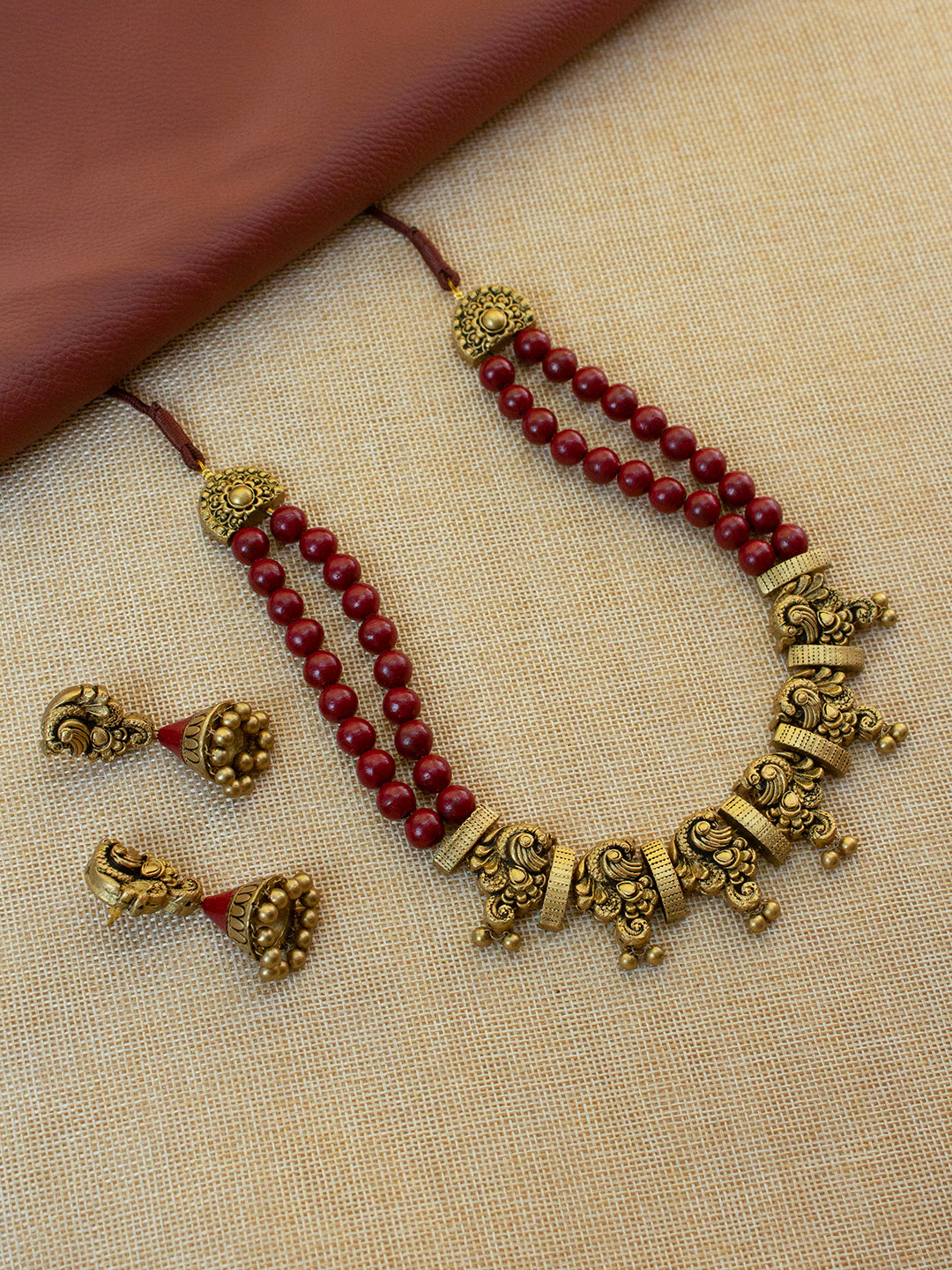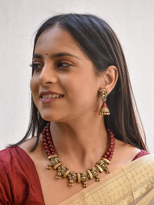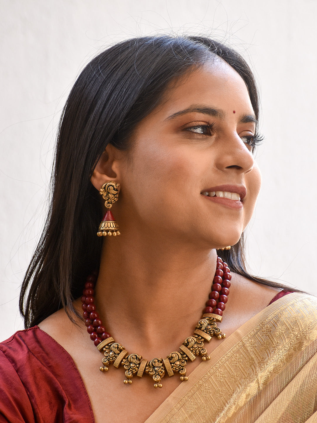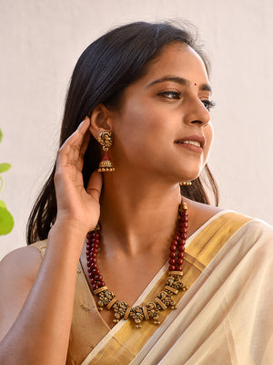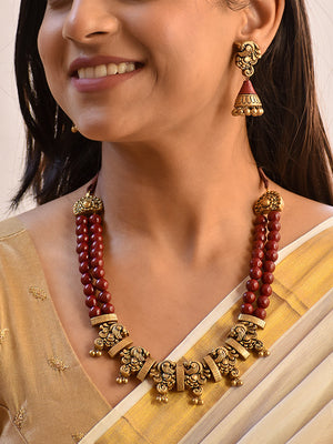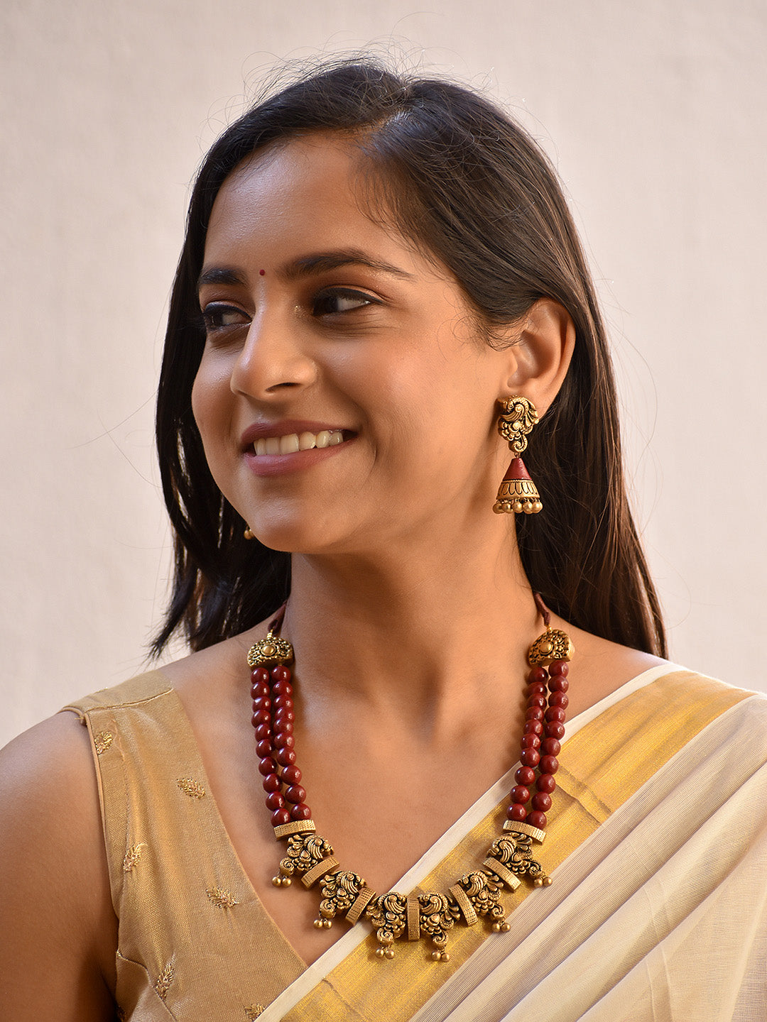 Devyani - Handcrafted Temple Two layer Terracotta Jewellery Set in Maroon & Antique Gold