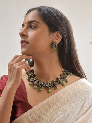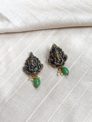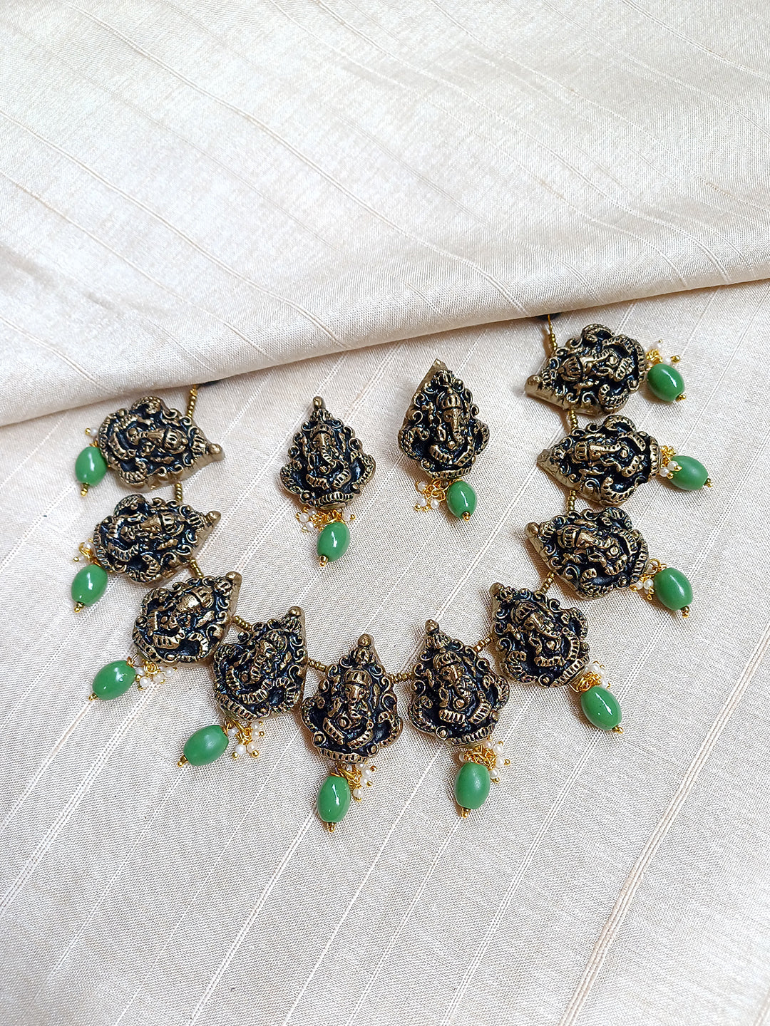 Handcrafted Terracotta Ganesha Necklace Set with Antique Gold Finish, Green Beads, and Matching Earrings