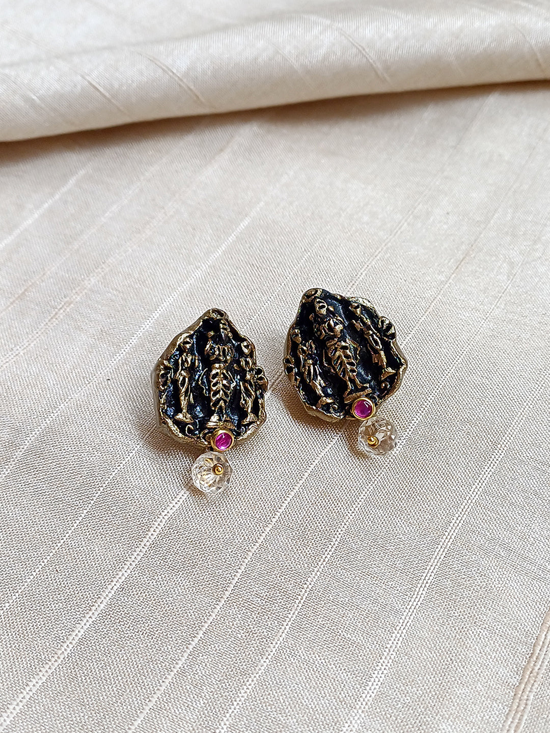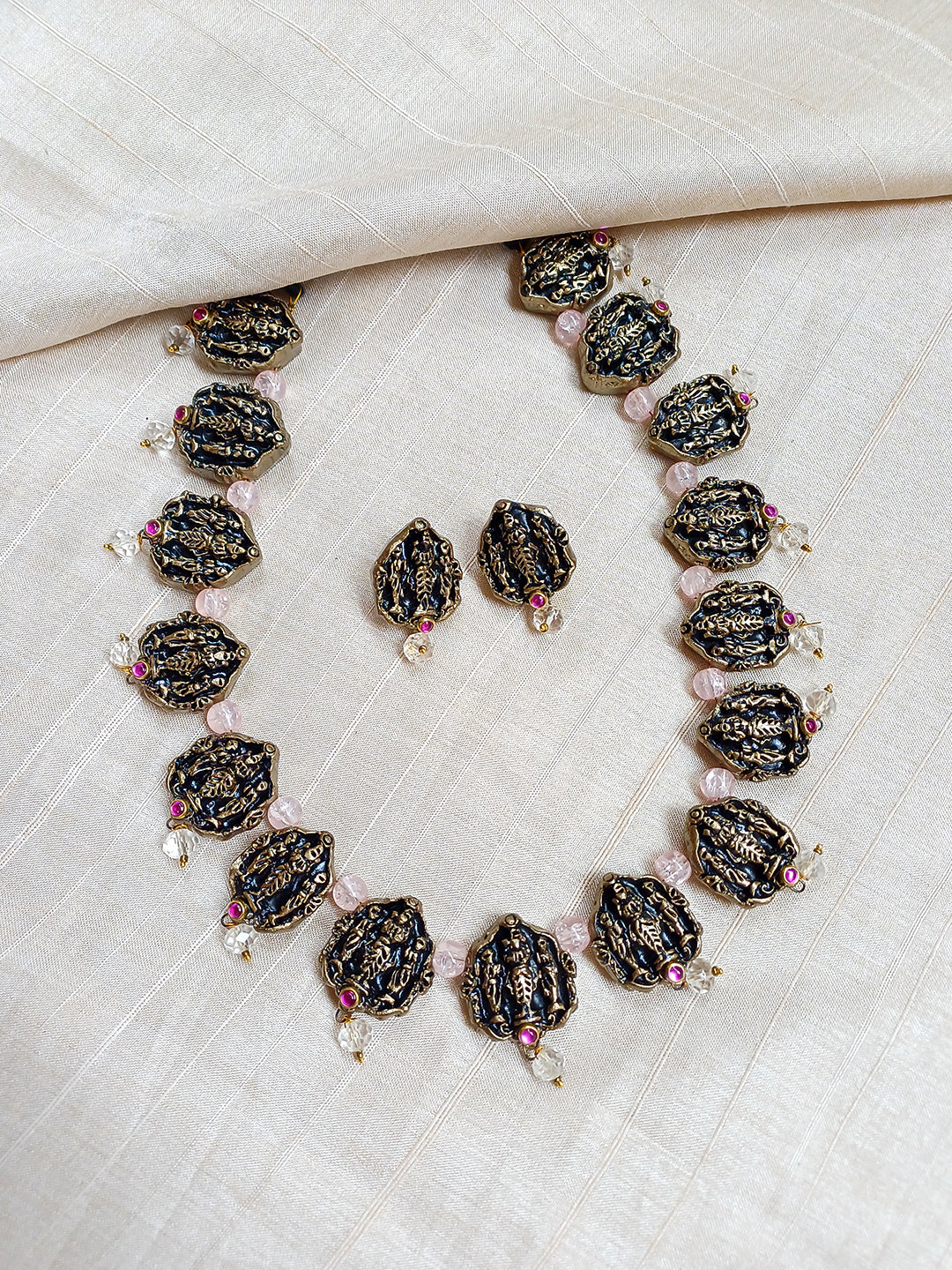 Handcrafted Terracotta Lord Venkateshwara Necklace Set with Antique Gold Beads, Pink Accents, and Matching Stud Earrings