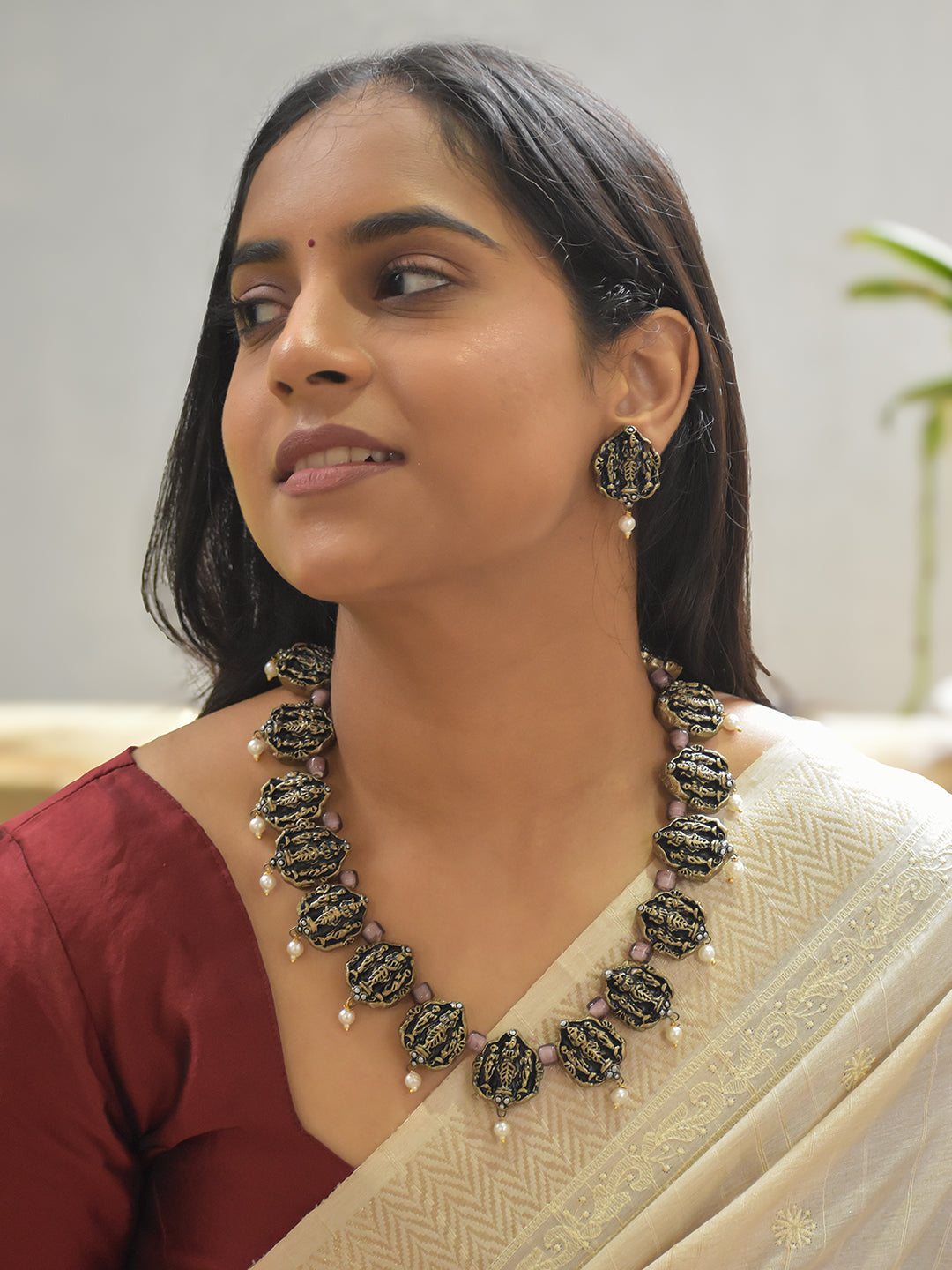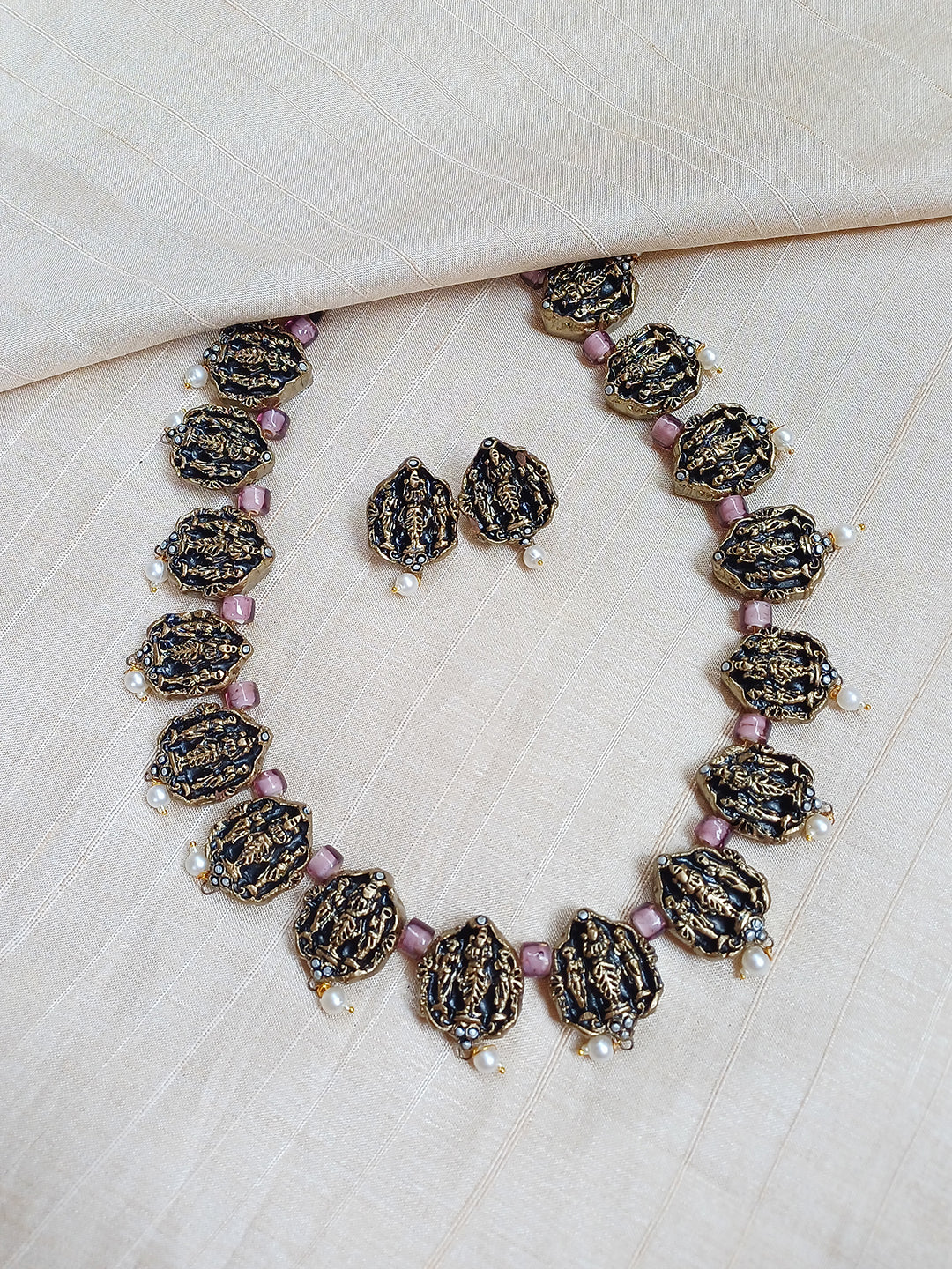 Handcrafted Terracotta Lord Venkateshwara Necklace Set with Antique Gold Beads, Purple Accents, and Pearl Drops