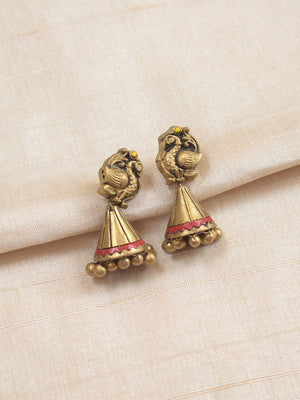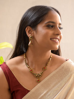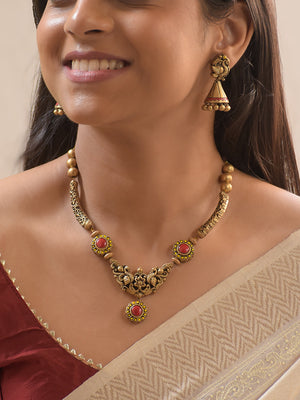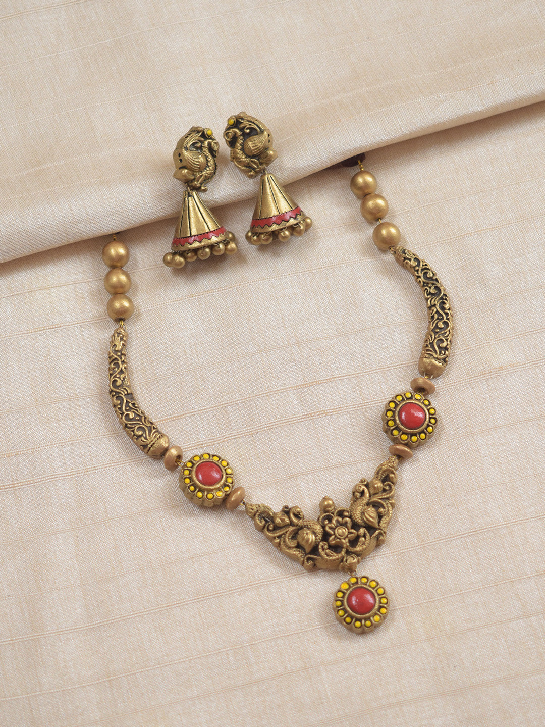 Mayuralika - Handcrafted Terracotta Peacock Motif Necklace Set with Red-Yellow Floral Accents and Antique Gold Beads and Matching Earrings