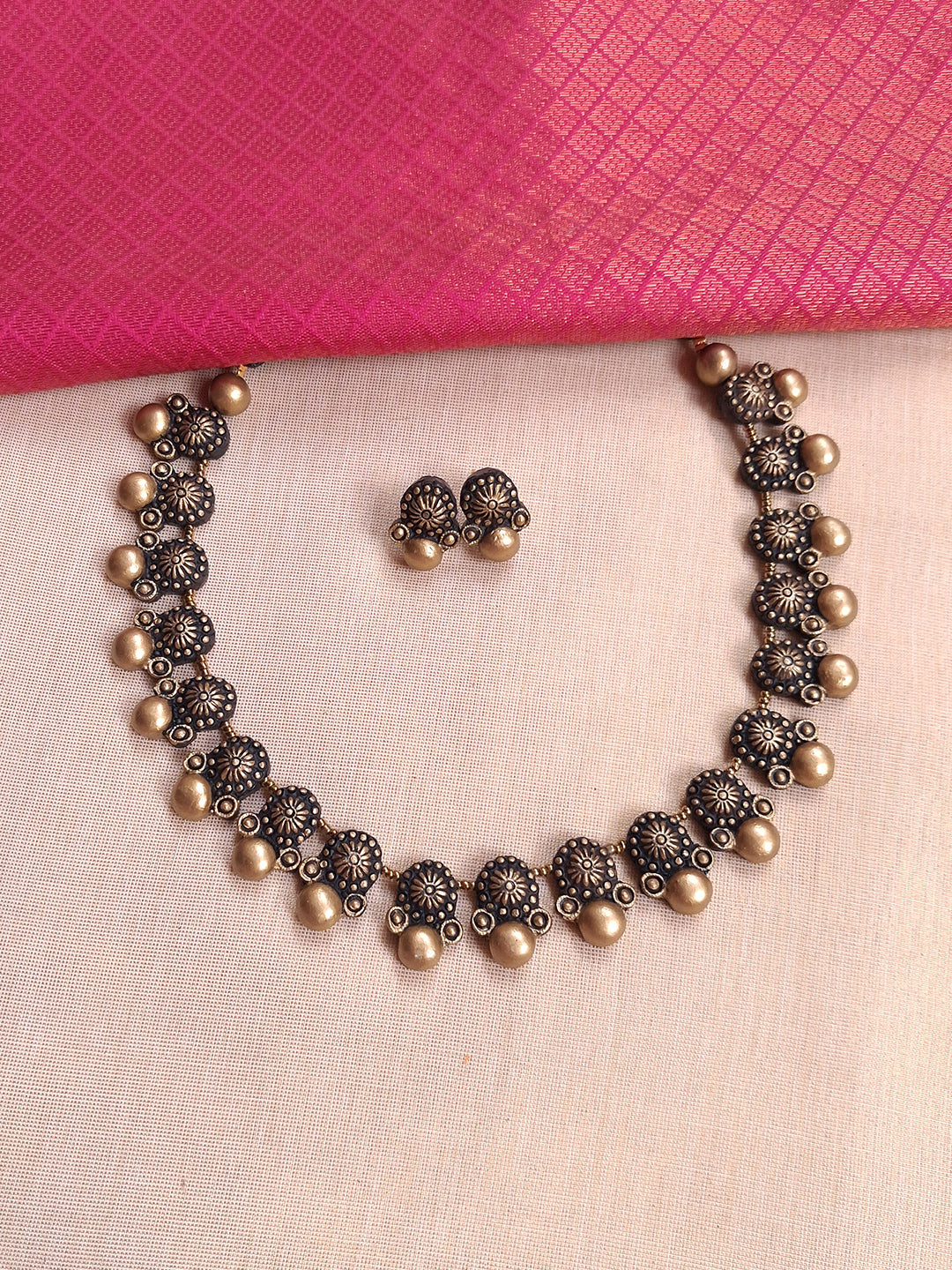 Handmade Terracotta Antique Gold Floral Choker Necklace with Bead Drops and Matching Stud Earrings