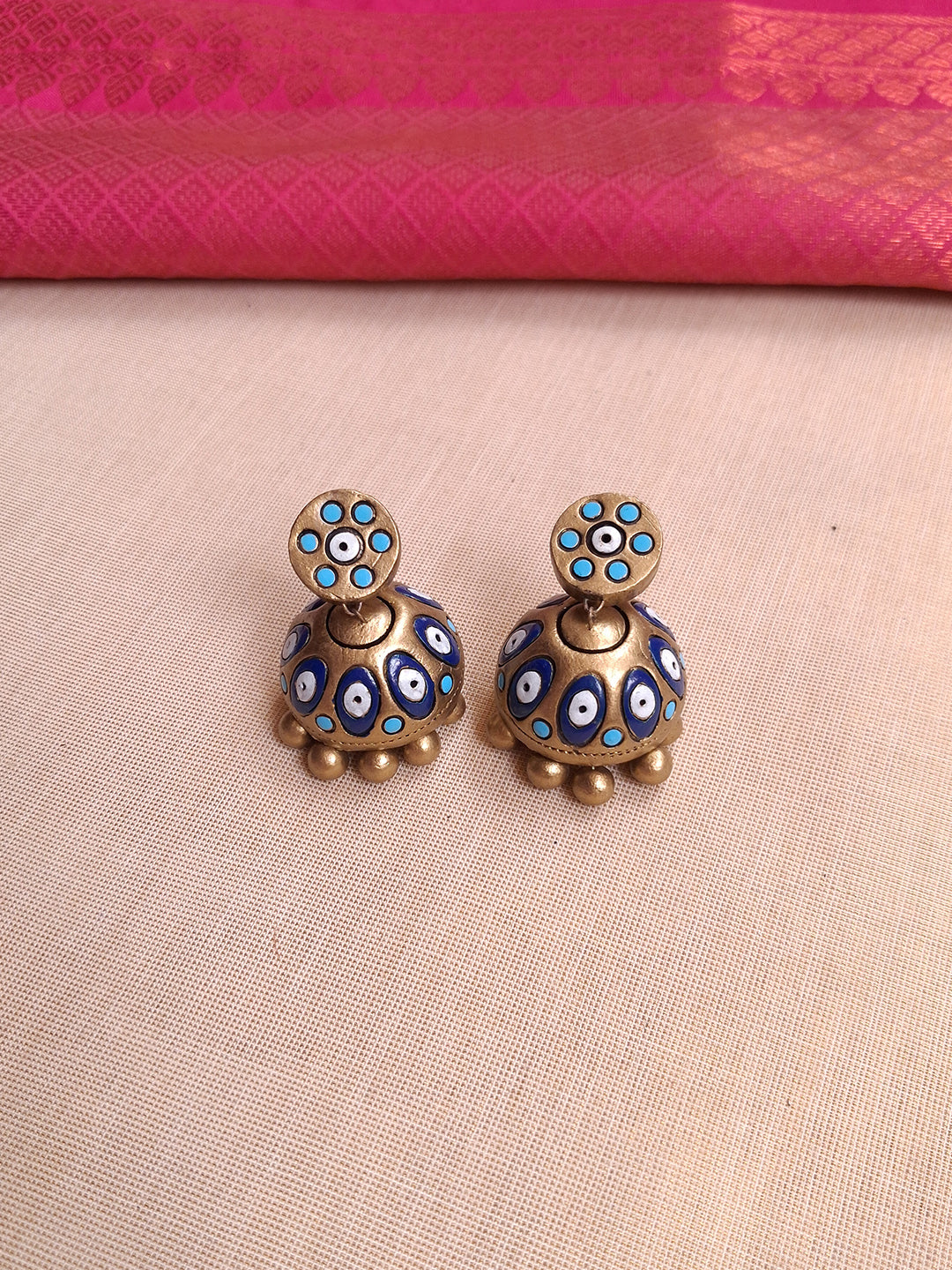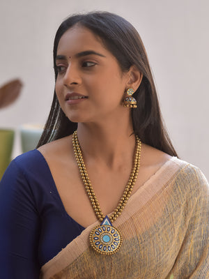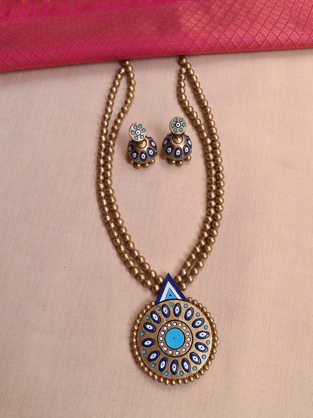 Handmade Terracotta Blue Mandala Pendant Necklace with Golden Beads and Matching Jhumka Earrings - Evil Eye