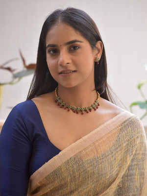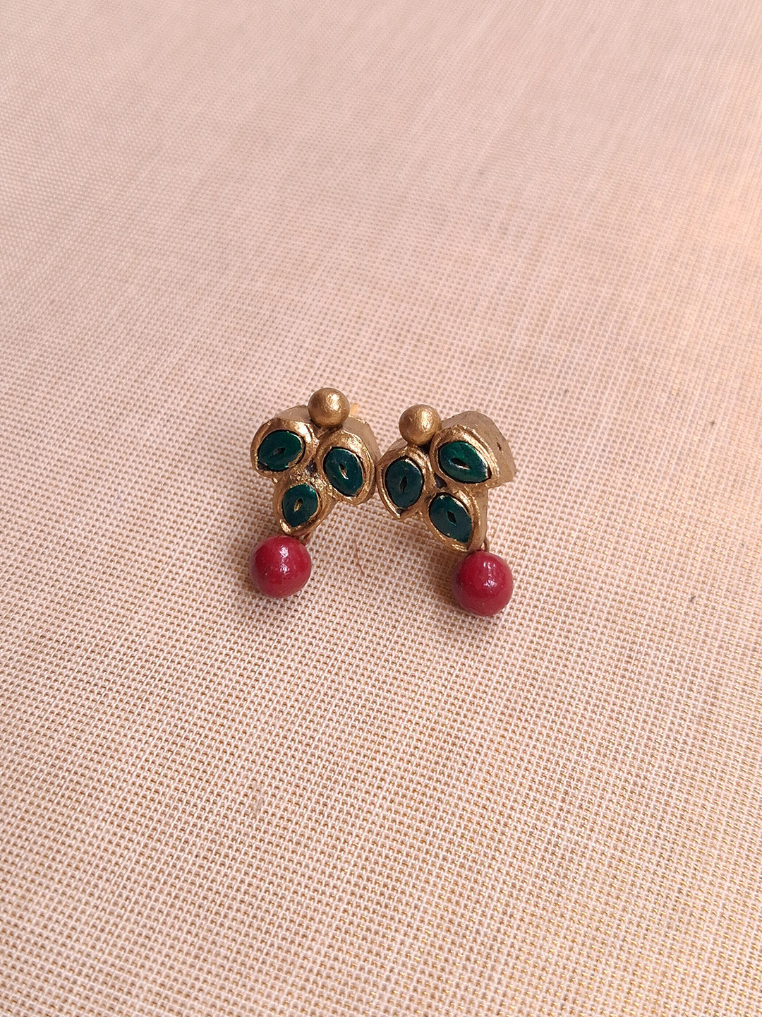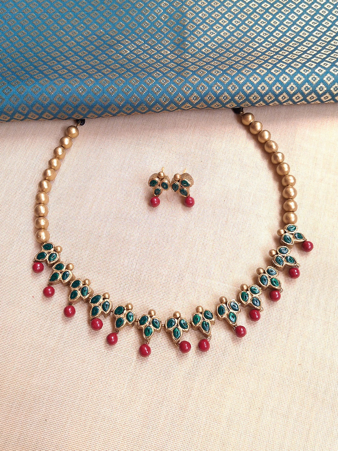 Handmade Terracotta Floral Choker Necklace with Red Bead Drops and Stud Earrings