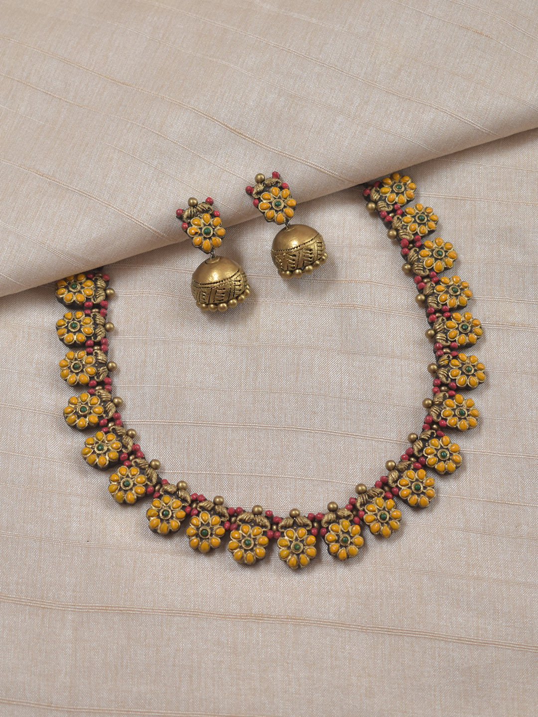 Pushkara - Handmade Terracotta Floral Necklace Set – Yellow Red & Antique Gold Earrings