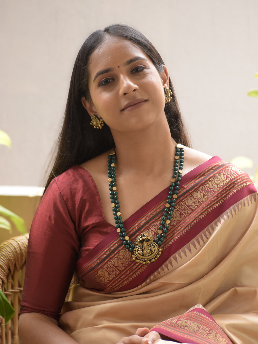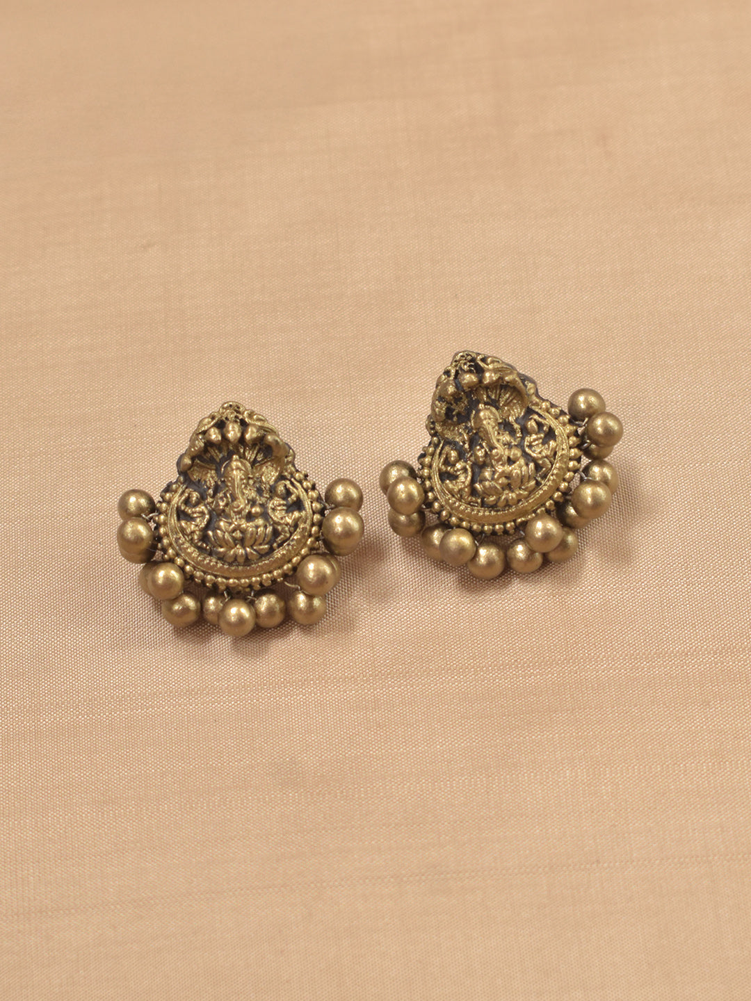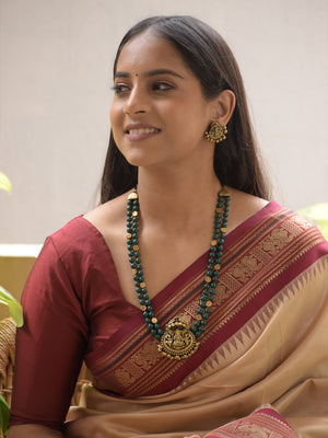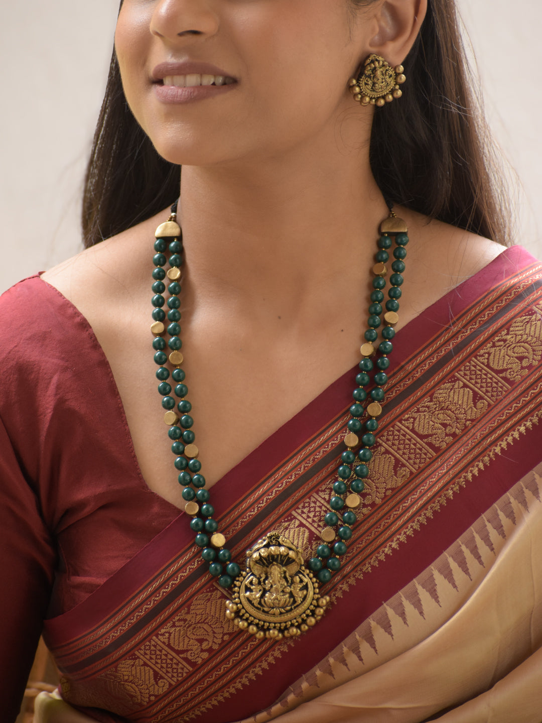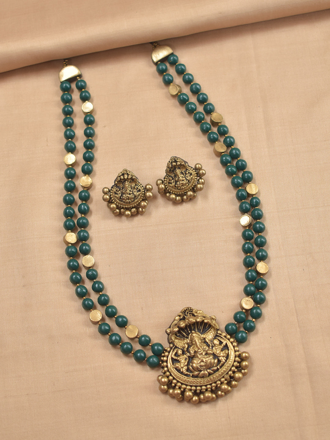 Vighneshvara - Handmade Terracotta Ganesha Pendant Necklace Set with Green Beads and Antique Gold Accents Earrings