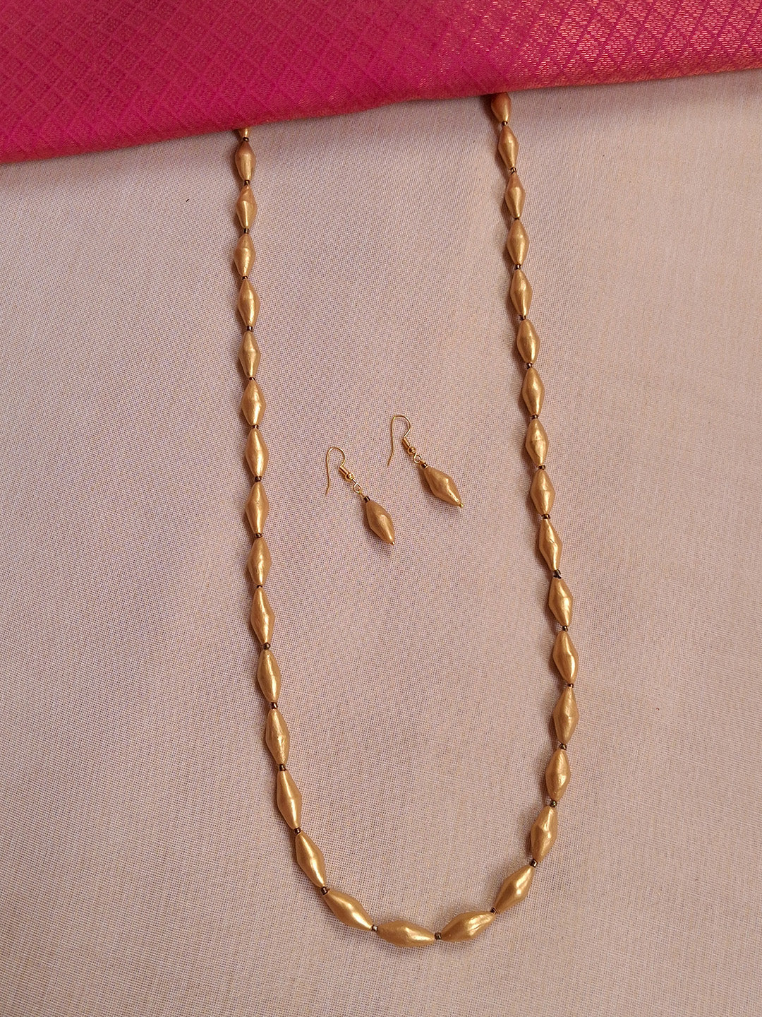 Handmade Terracotta Golden Bead Necklace with Drop Earrings