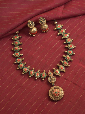 Lakshmira - Handmade Terracotta Lakshmi Pendant Necklace Set in Antique Gold with Red & Green Accents and Matching Earrings