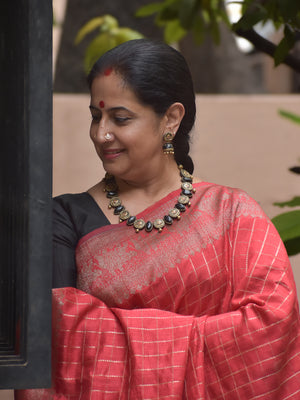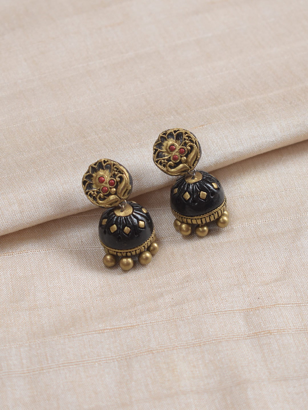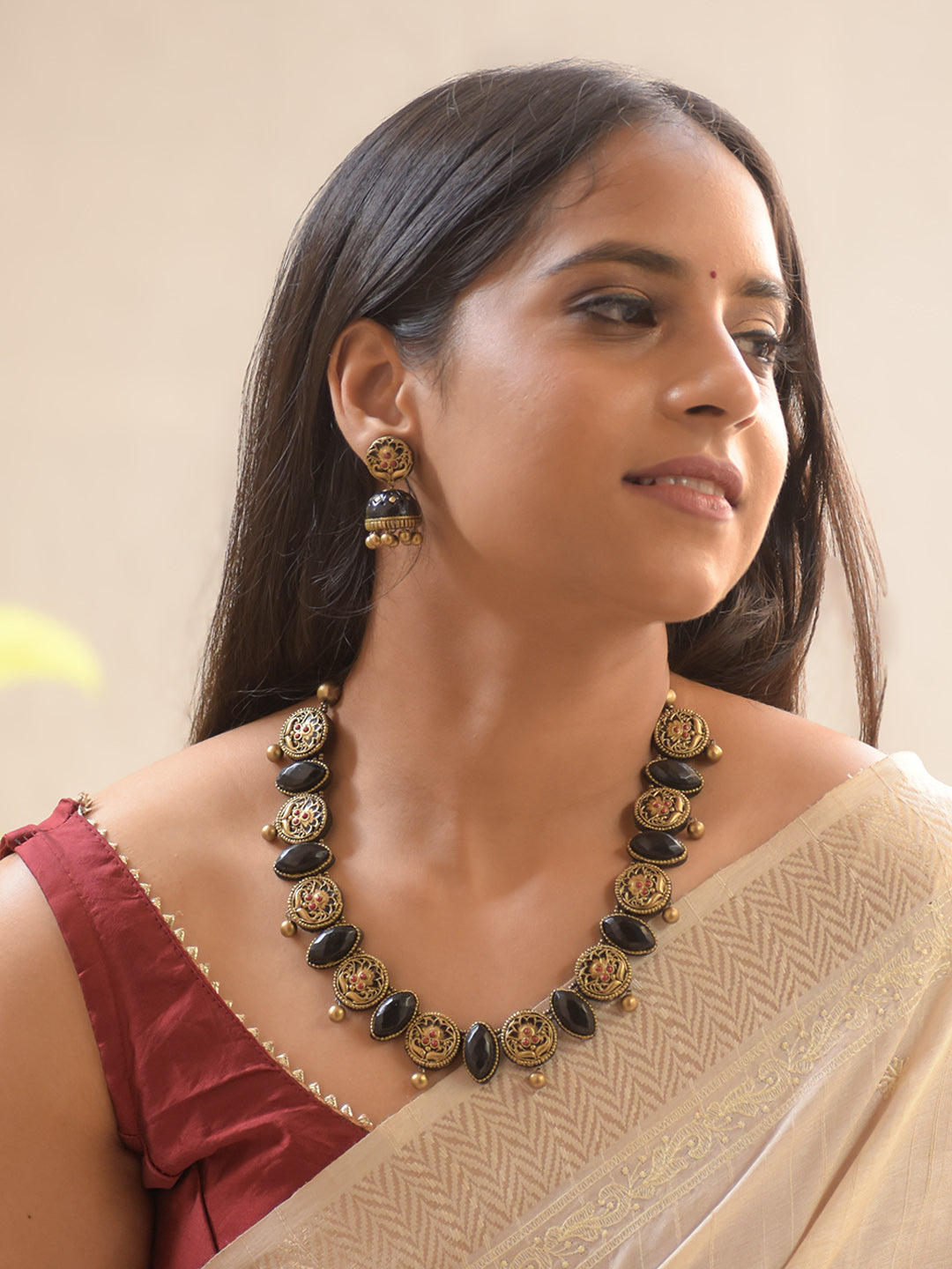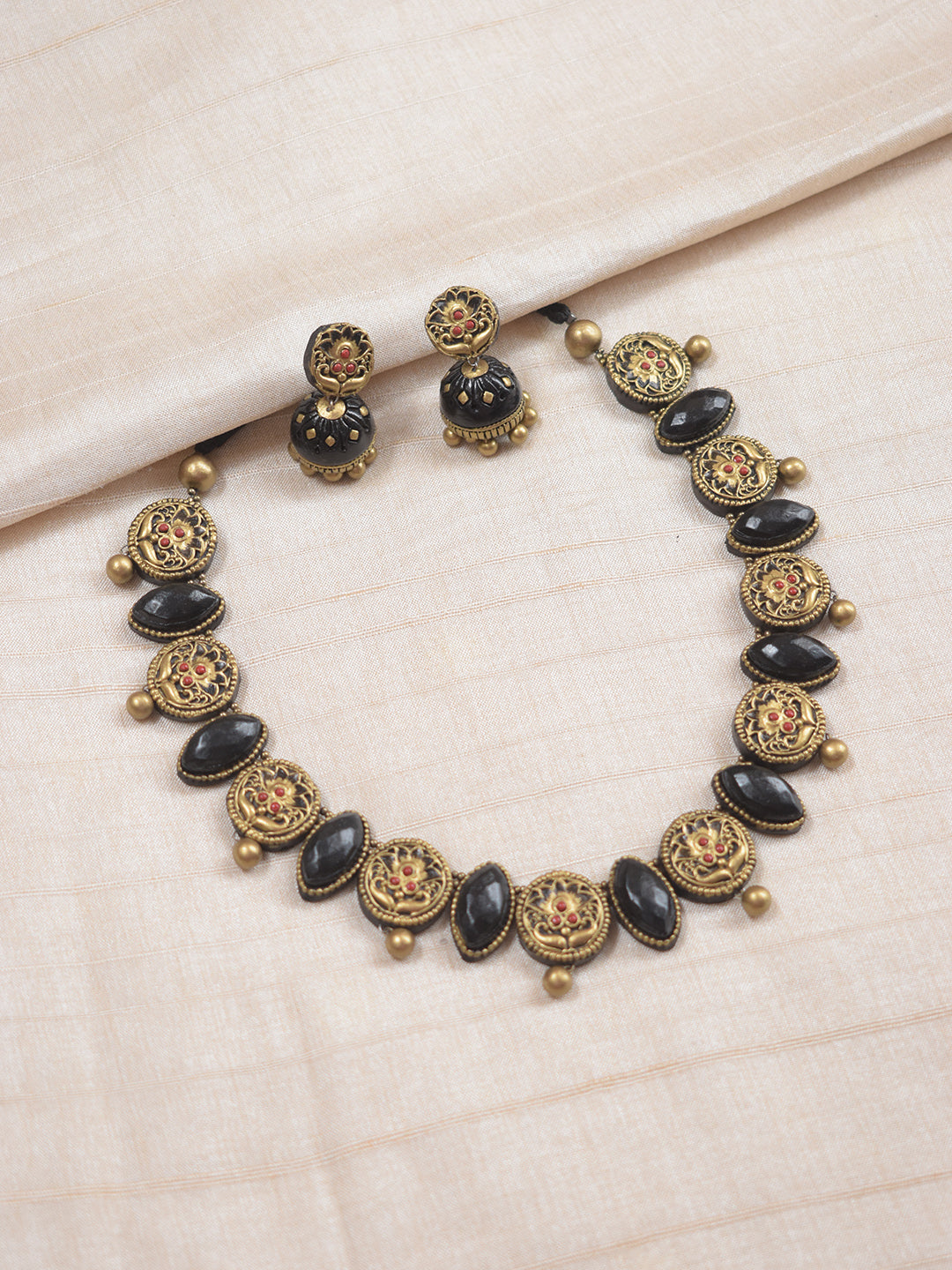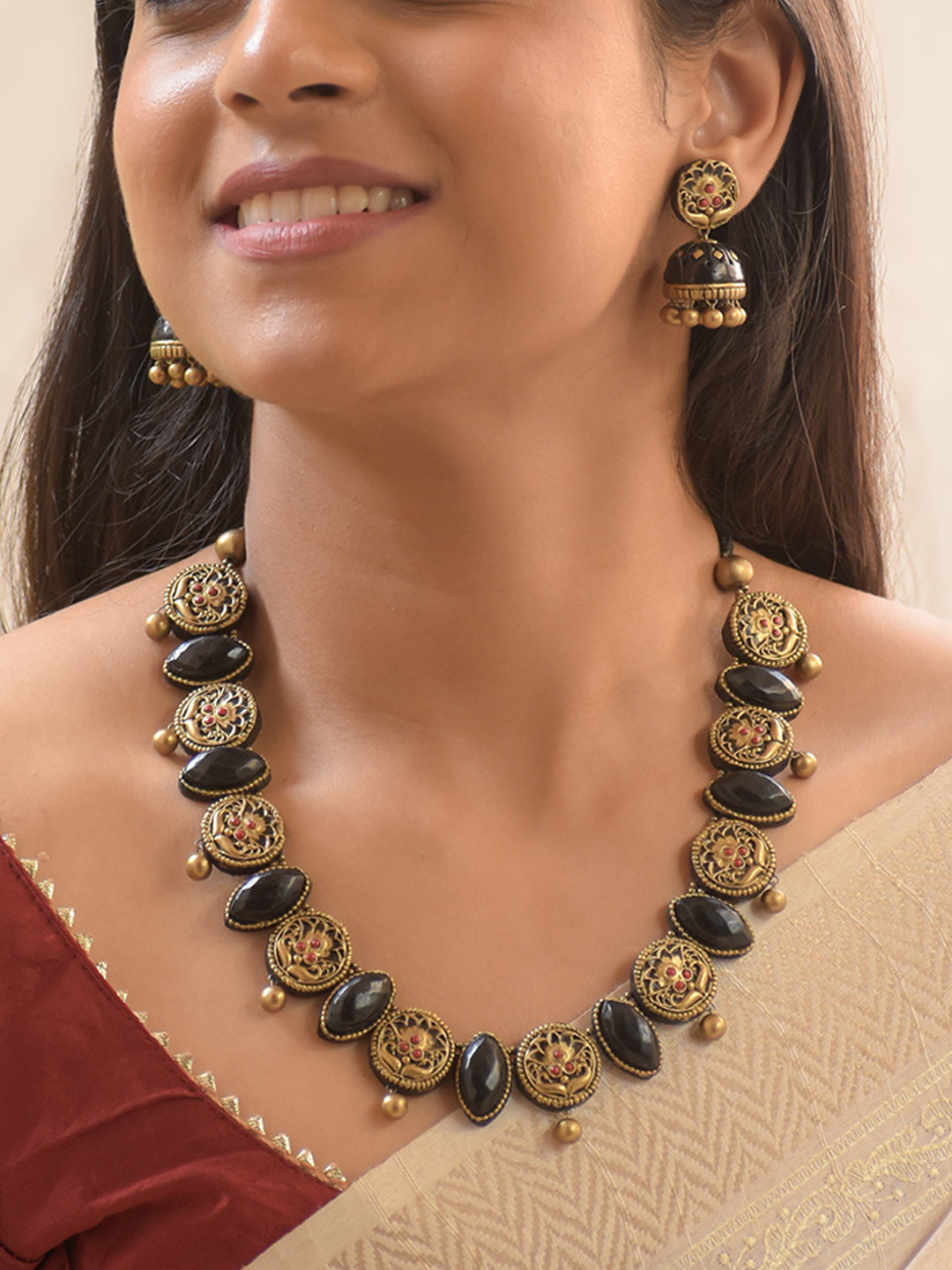Krithika - Handmade Terracotta Necklace Set – Black Oval Beads with Antique Floral Medallions Matching Earrings
