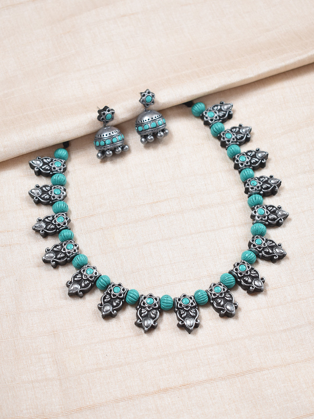 Shivaranjani - Handmade Terracotta Oxidized Silver Peacock Necklace Set with Blue Accents and Matching Earrings