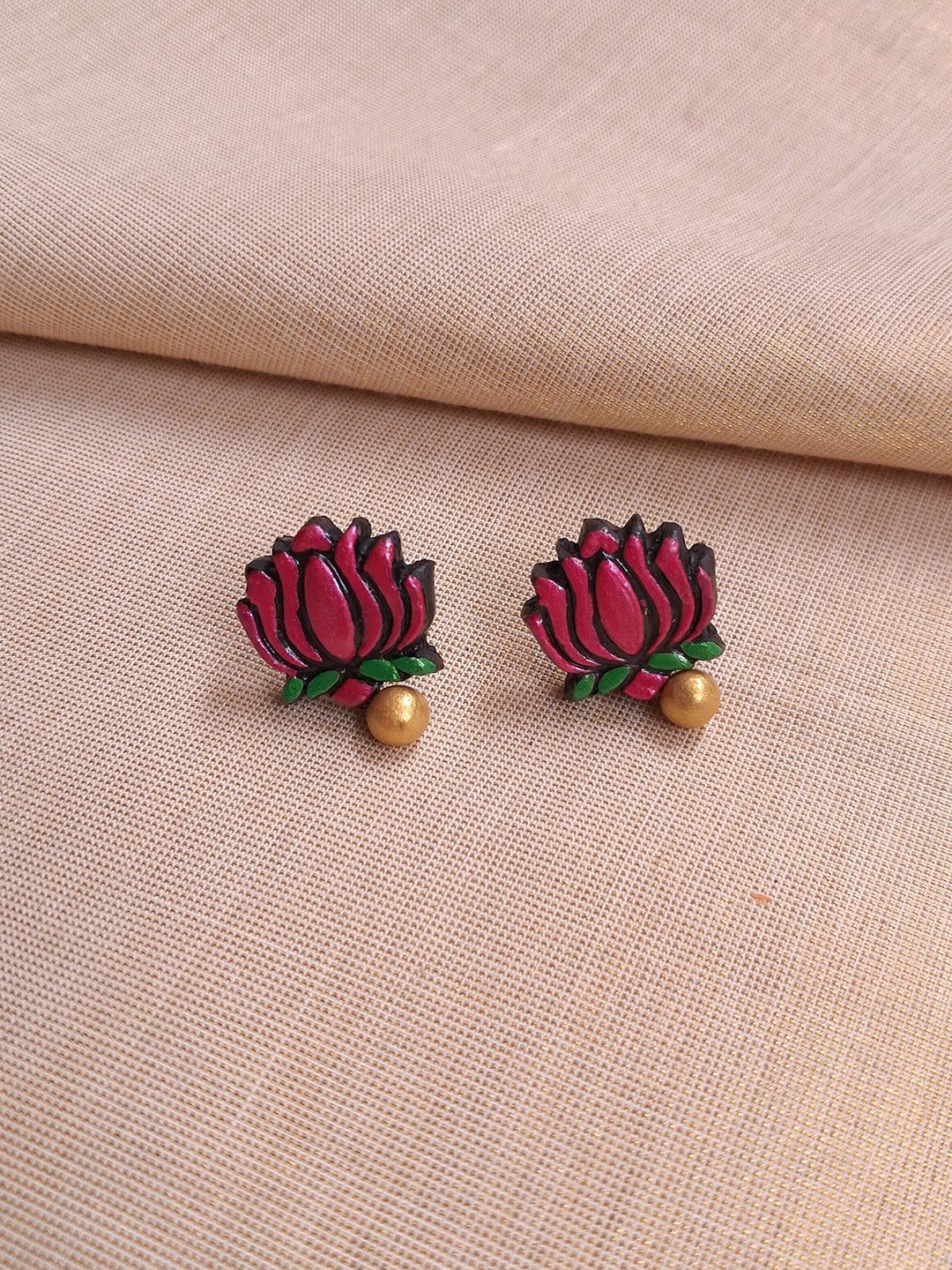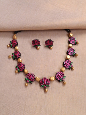 Handmade Terracotta Pink Lotus Floral Necklace with Golden Bead Drops