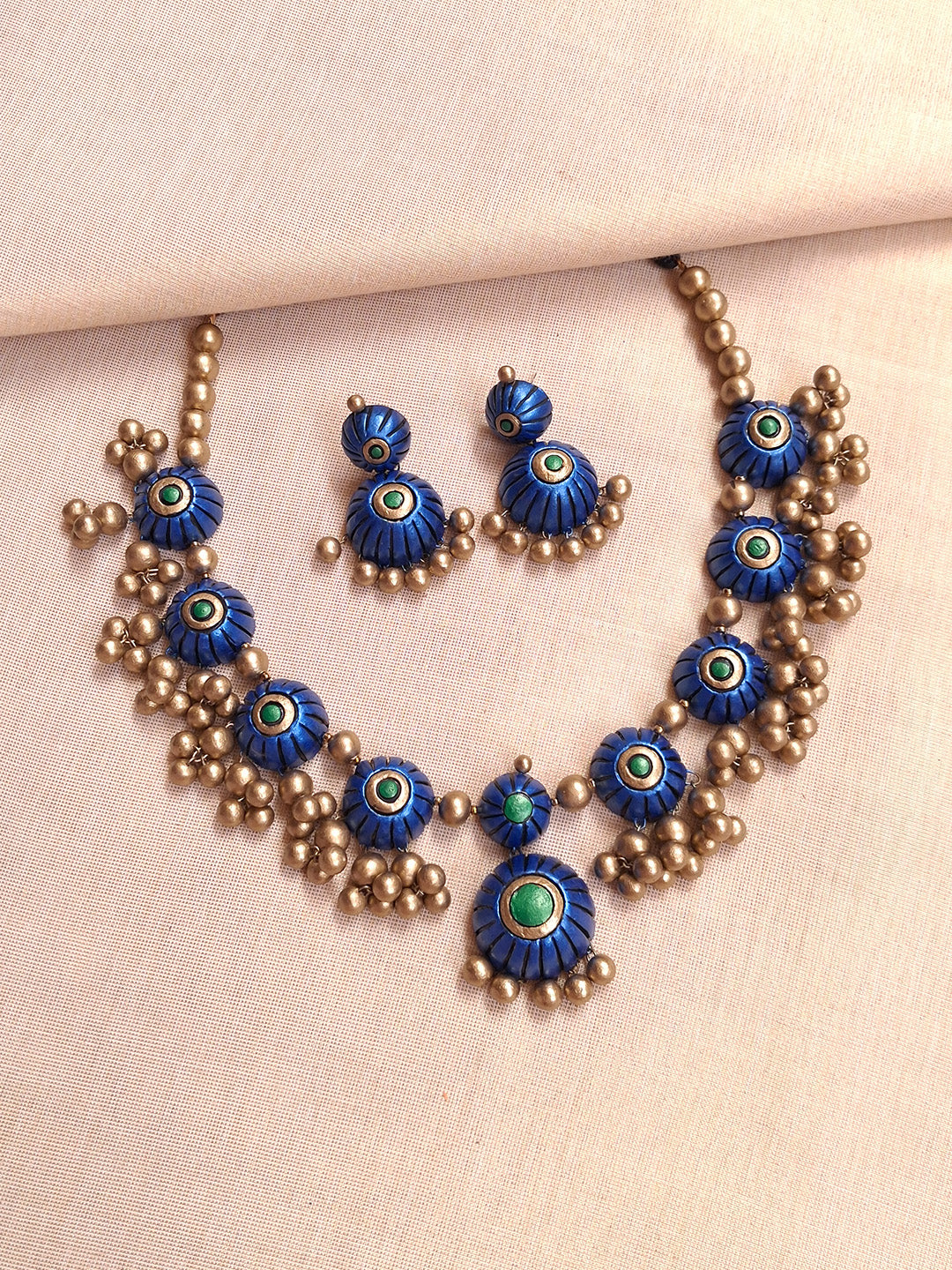 Handmade Terracotta Royal Blue Floral Beaded Necklace with Golden Cluster Drops and Stud Earrings