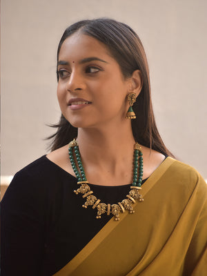 Hemangika – Terracotta Temple Necklace Set with Dual Green Bead Strands and Antique Peacock Motifs