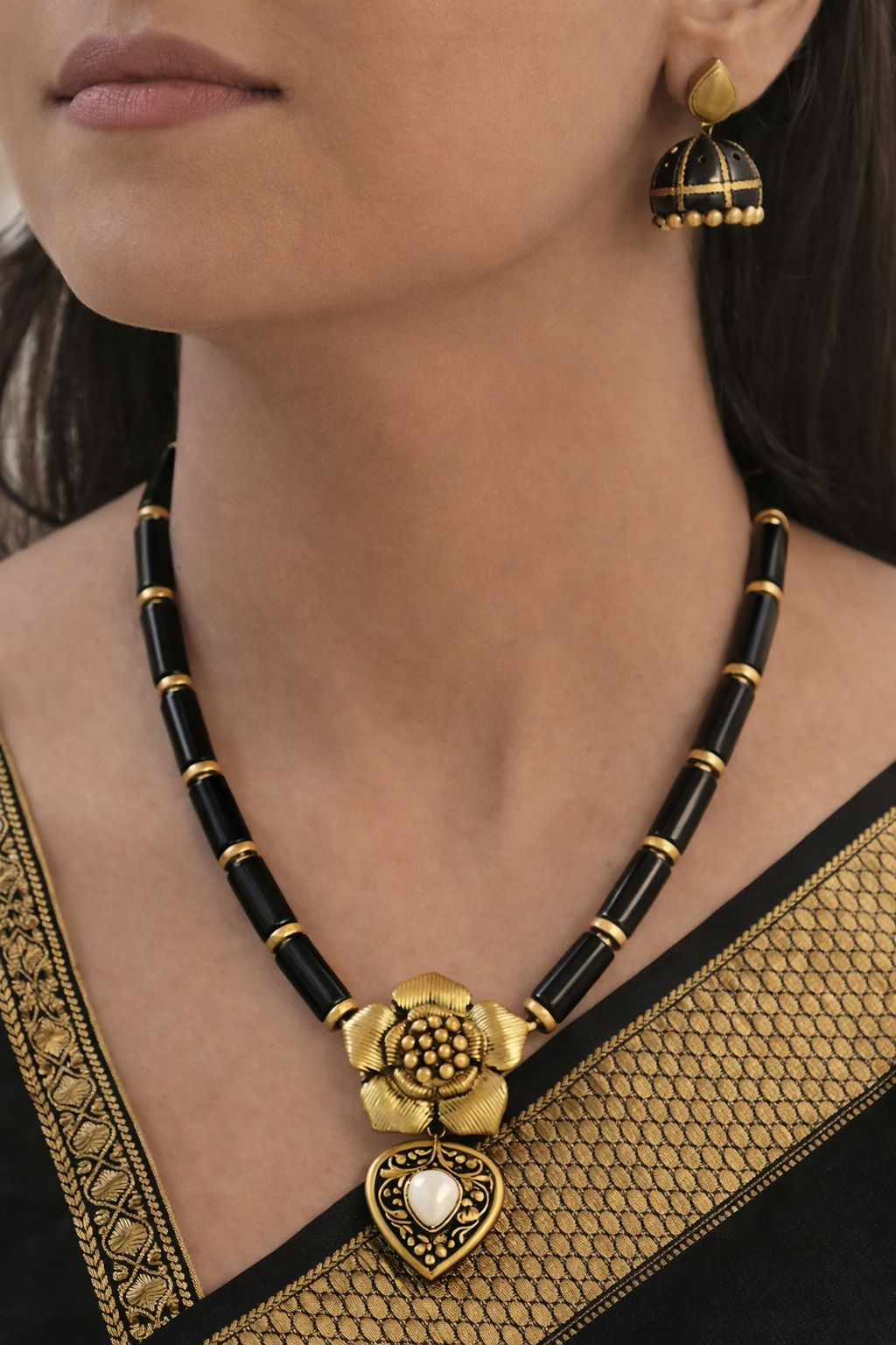 Kṛṣṇa Pushpa Lata — Golden Blossom Charm Black and Gold Terracotta Necklace Set With Jhumkas