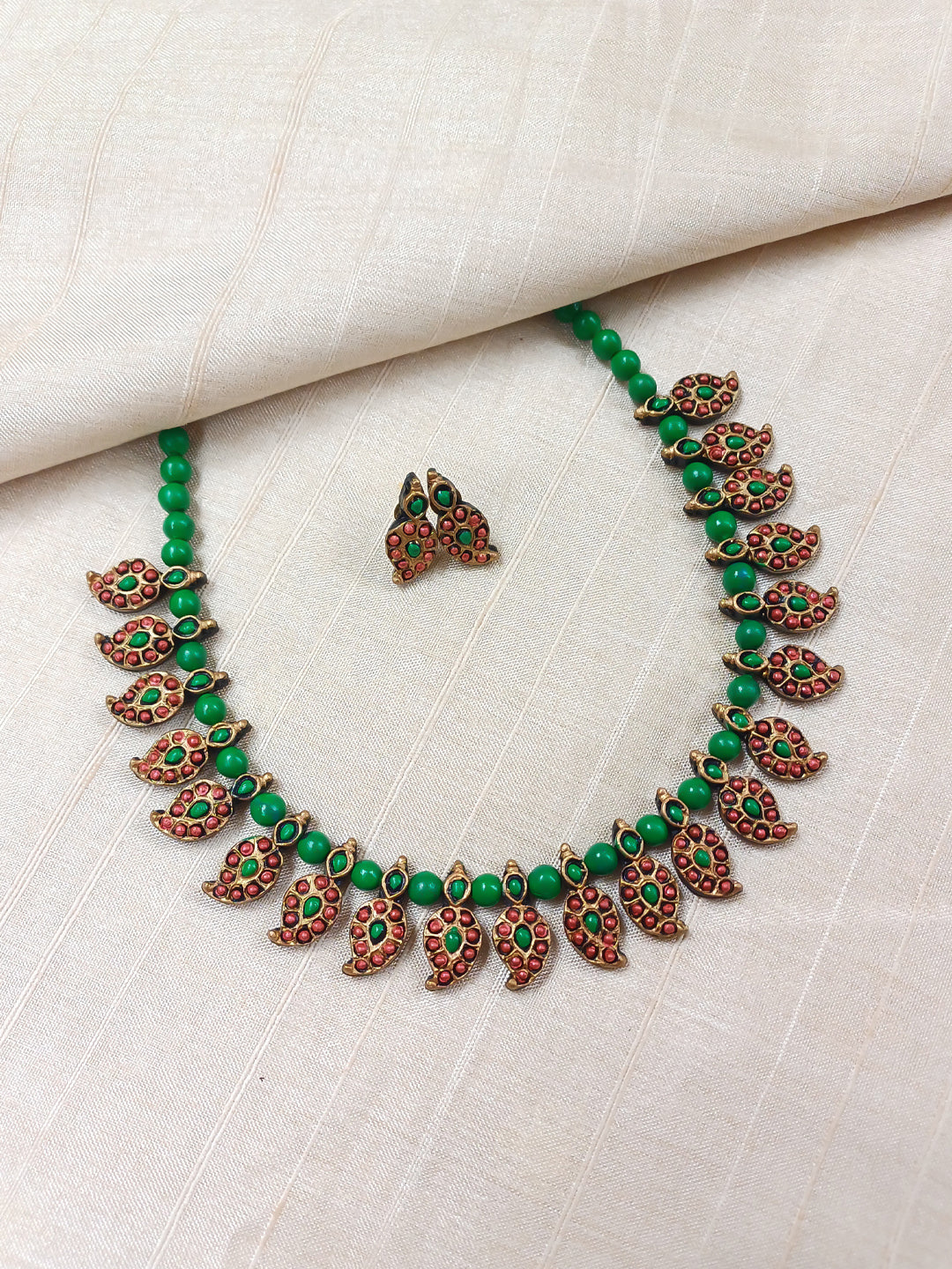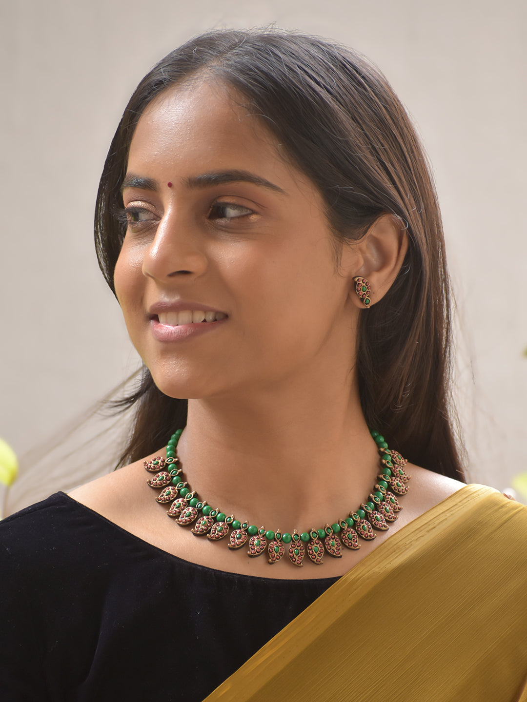 Verdhara - Mango Green Leaf Motif Terracotta Necklace Set Stud Earrings