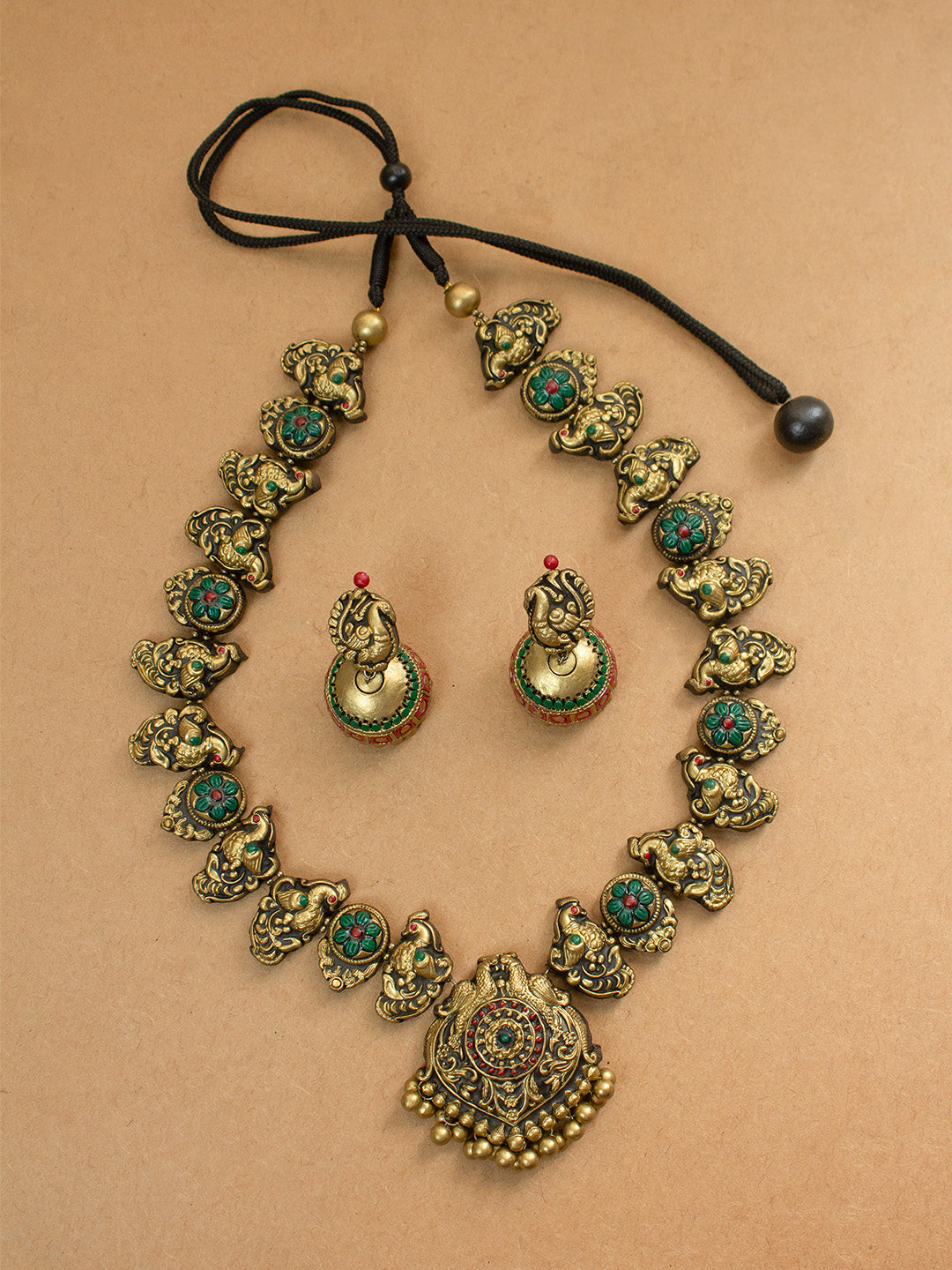 Marichimayura — Antique Gold Green and Marron Peacock Design Handmade Terracotta Necklace Set - Kantara