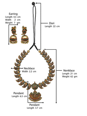 Mayuramra — Antique Gold Toned Peacock Design Pendant Red And Green Color With Mango Design Motifs Choker Handmade Terracotta Necklace Set - Kantara