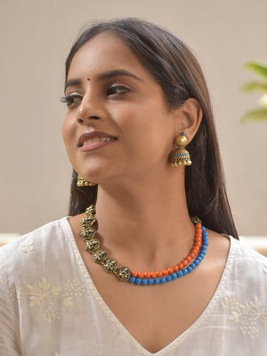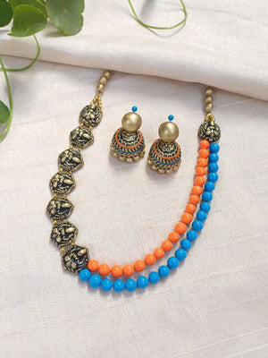 Tarunika - Orange Blue Harmony Antique Gold Terracotta Beaded Necklace Set With Matching Earrings