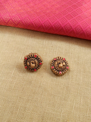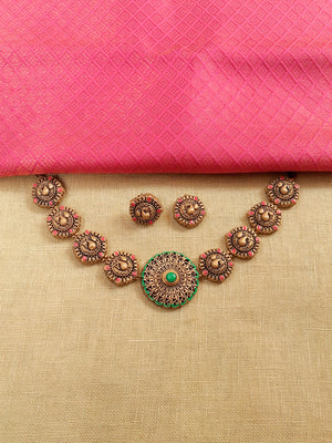 Padmaratha – Handmade Terracotta Antique Gold Coin Necklace Set with Pink Accents and Green Lotus Medallion Pendant