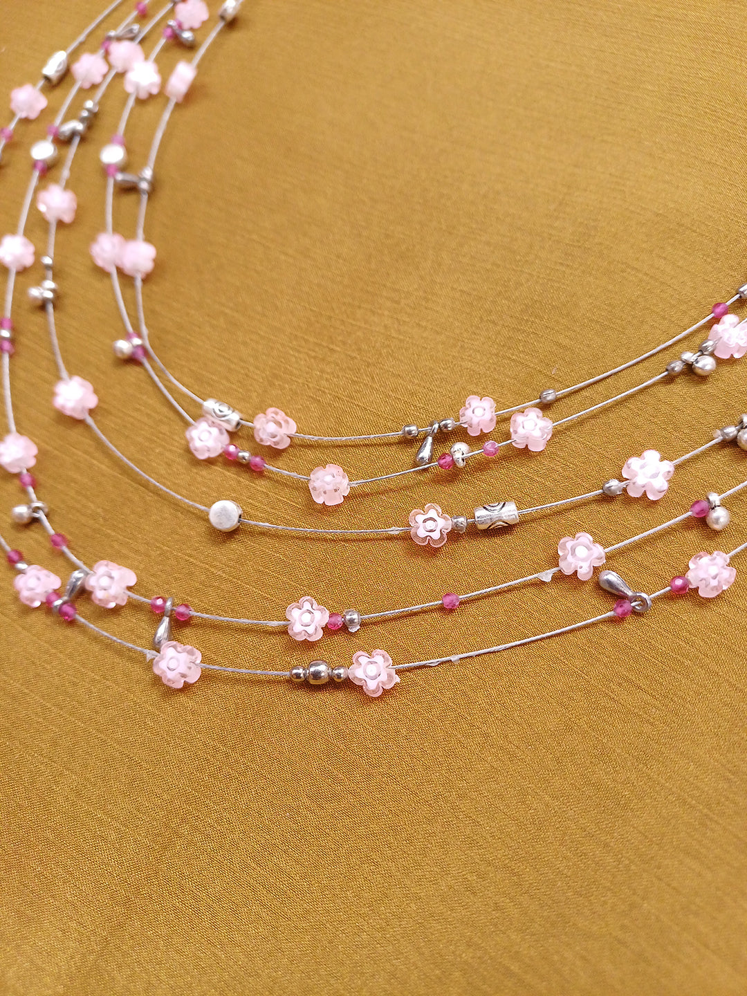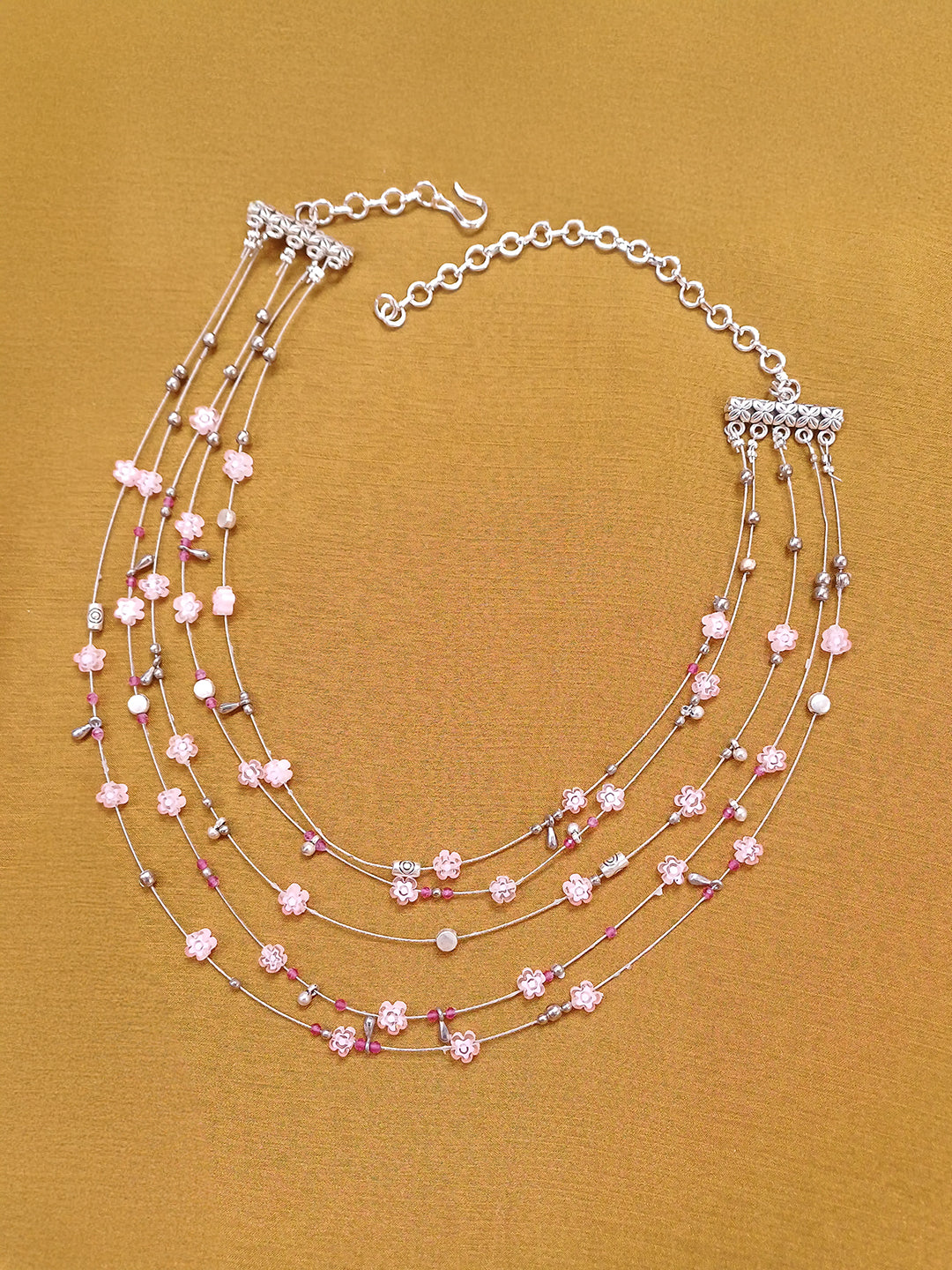 Primavera - Pink Floral Beaded Multi-Layer Necklaces with German Silver Accents