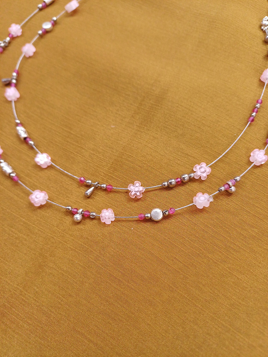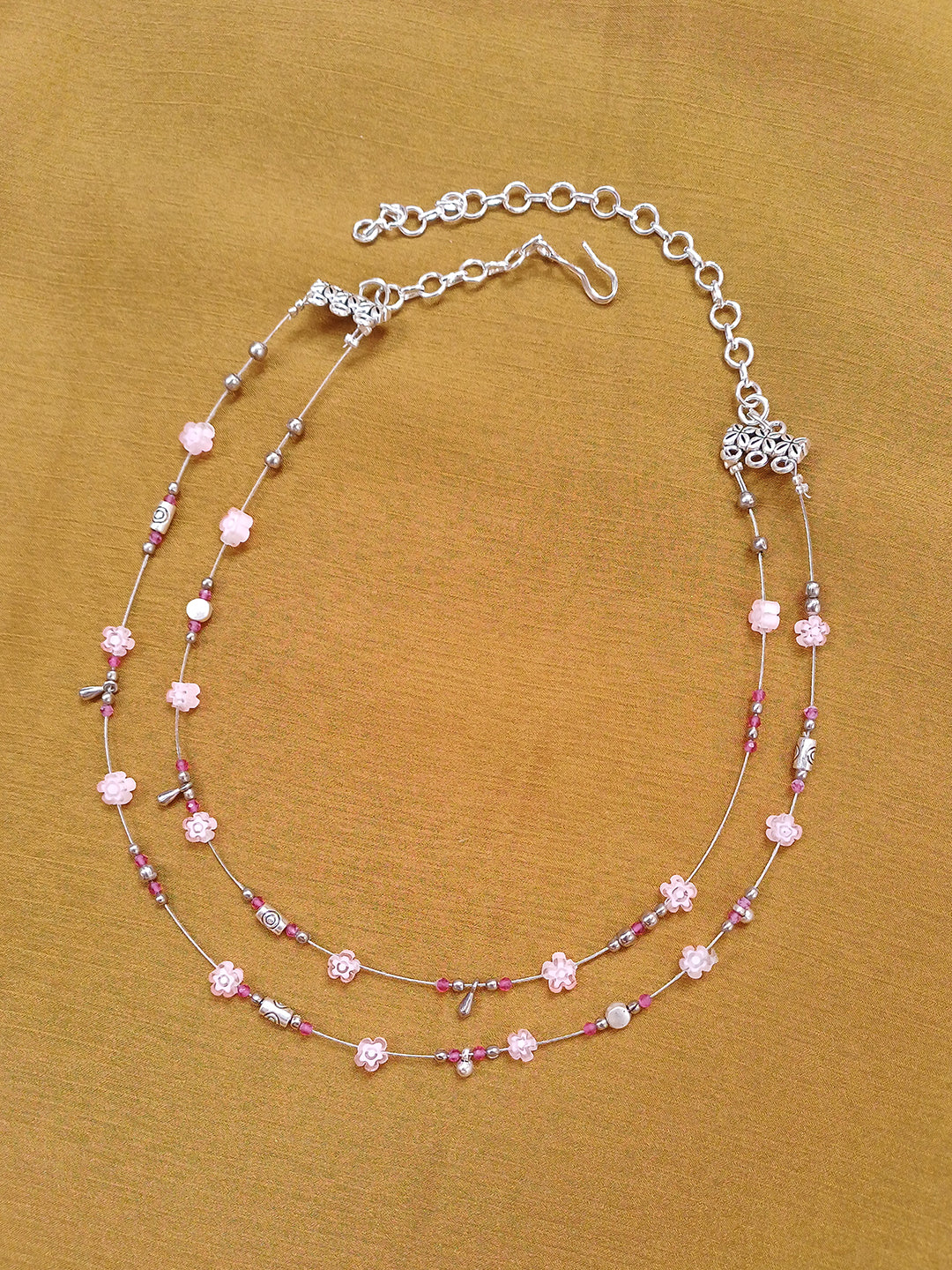 Primrose – Pink Floral Beaded Two-Layer Necklace with German Silver Accents