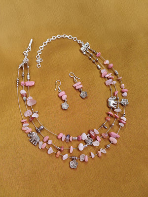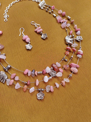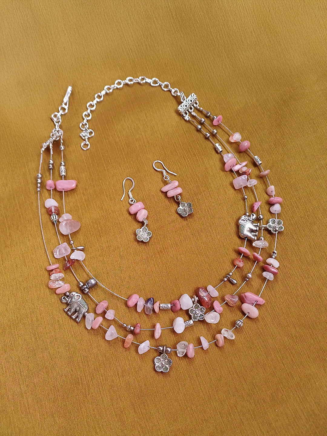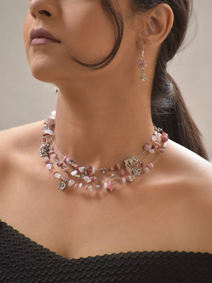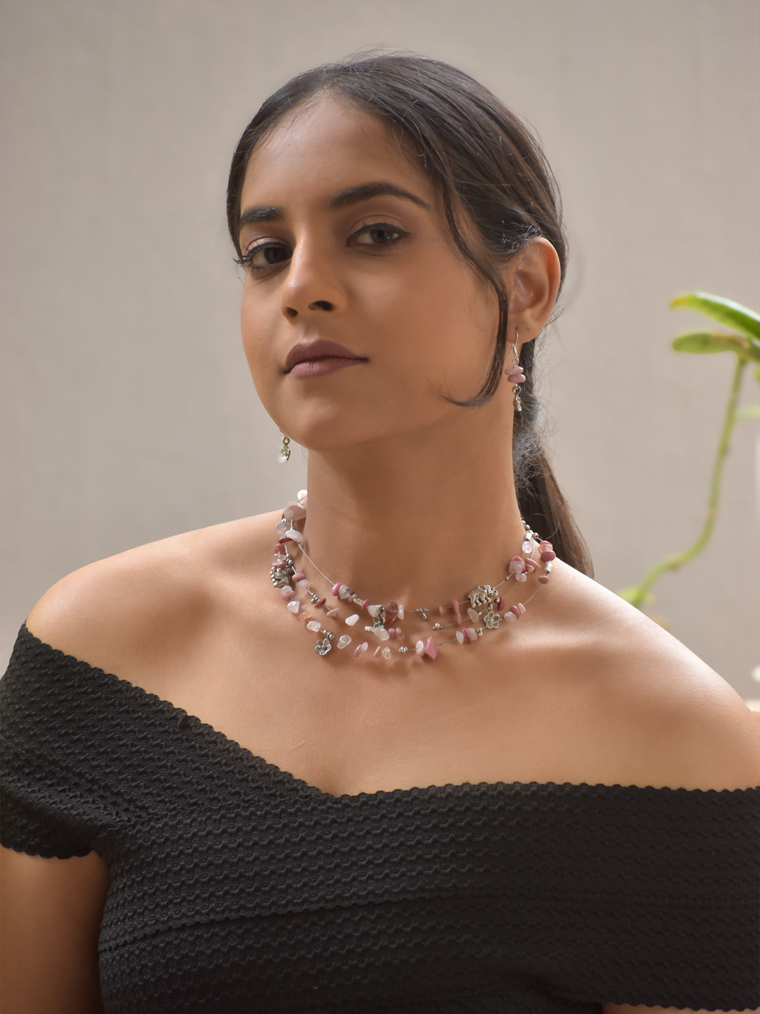 Rosélia – Pink Rose Quartz & Agate Gemstone Necklace with German Silver Motifs