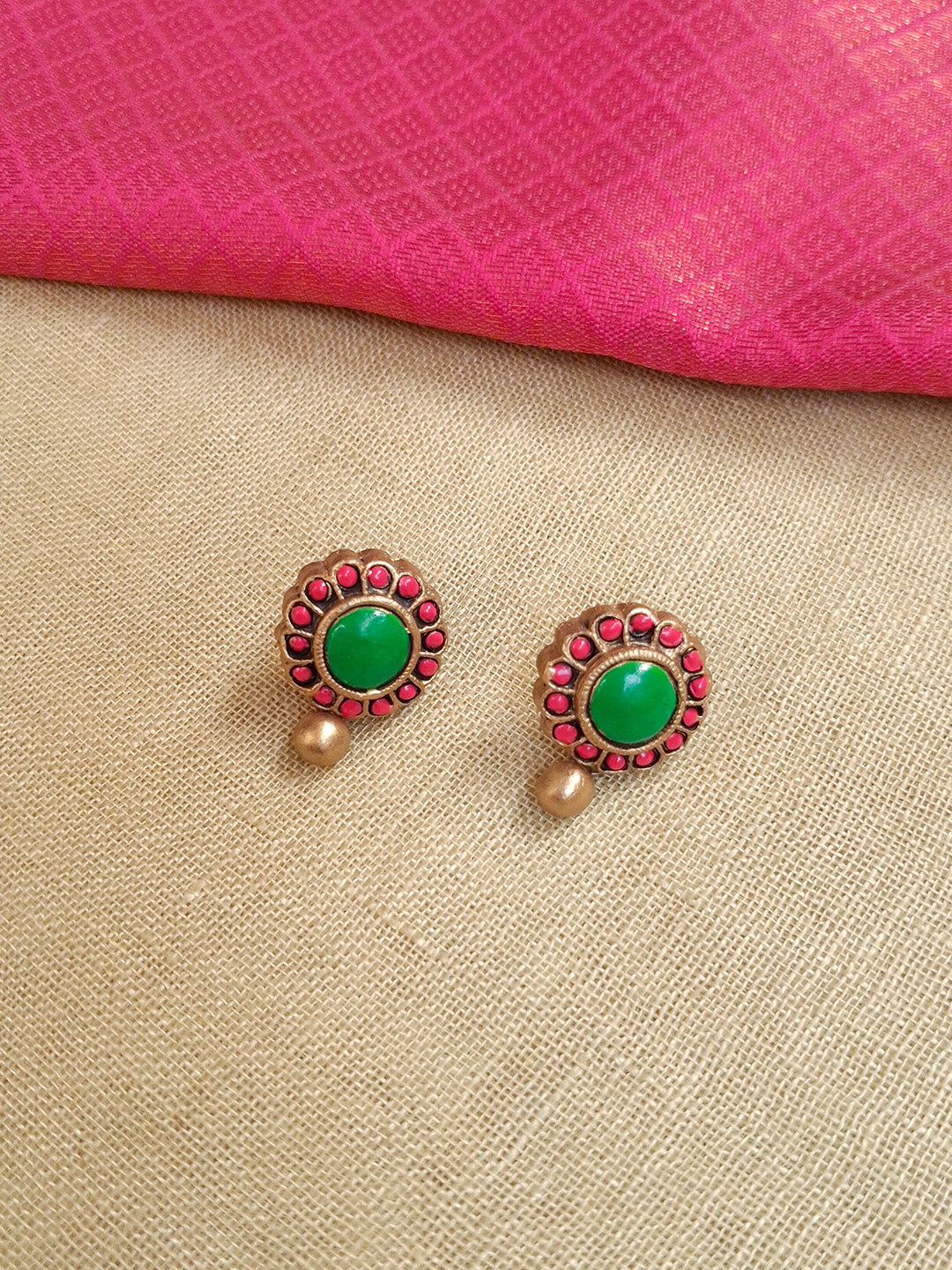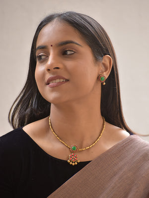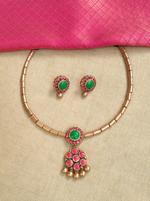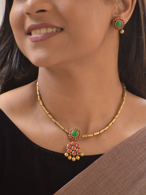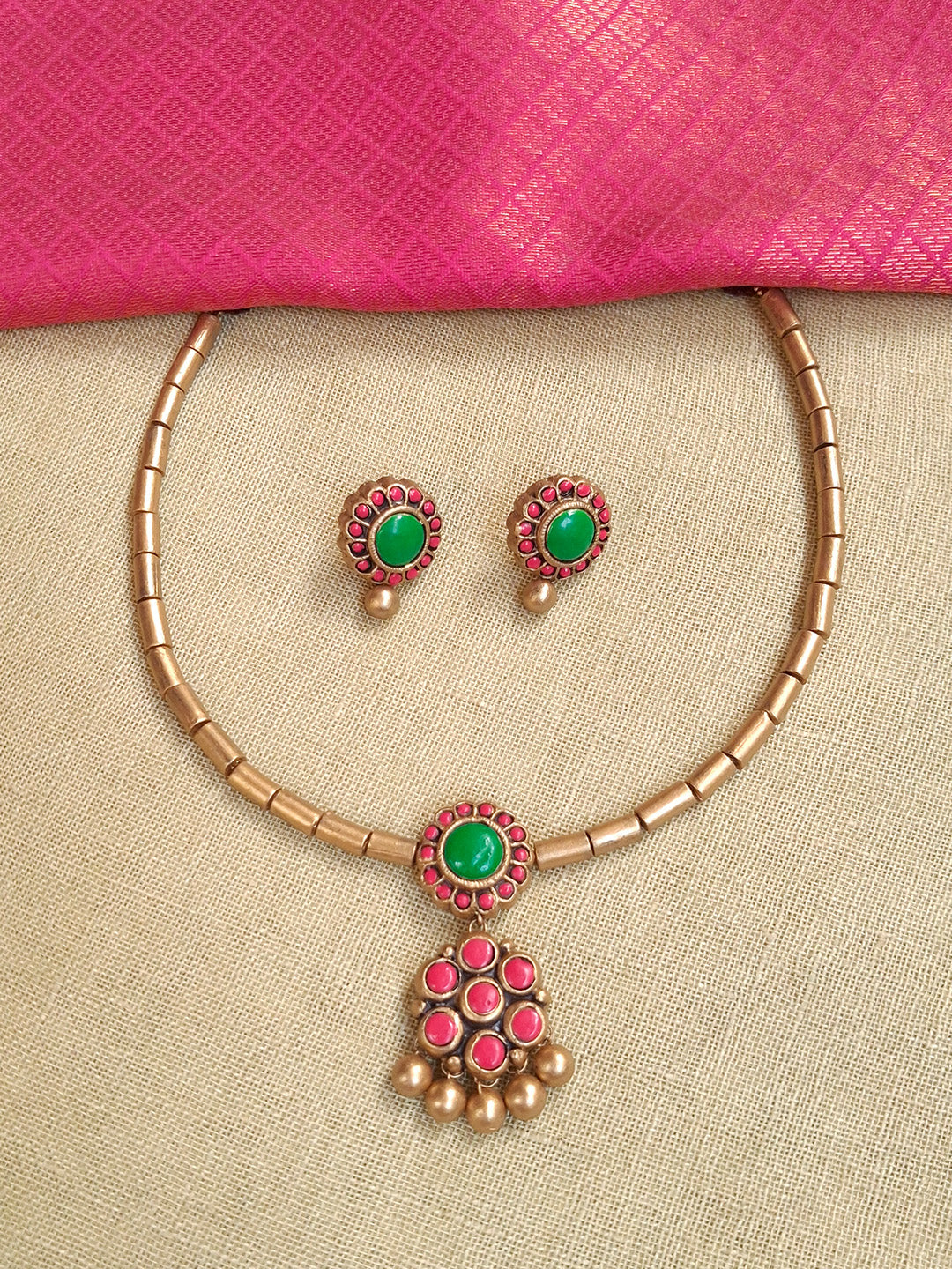 Rangtara – Handmade Terracotta Beaded Necklace Set with Green Centerpiece, Pink Stud Motifs & Antique Gold Drops