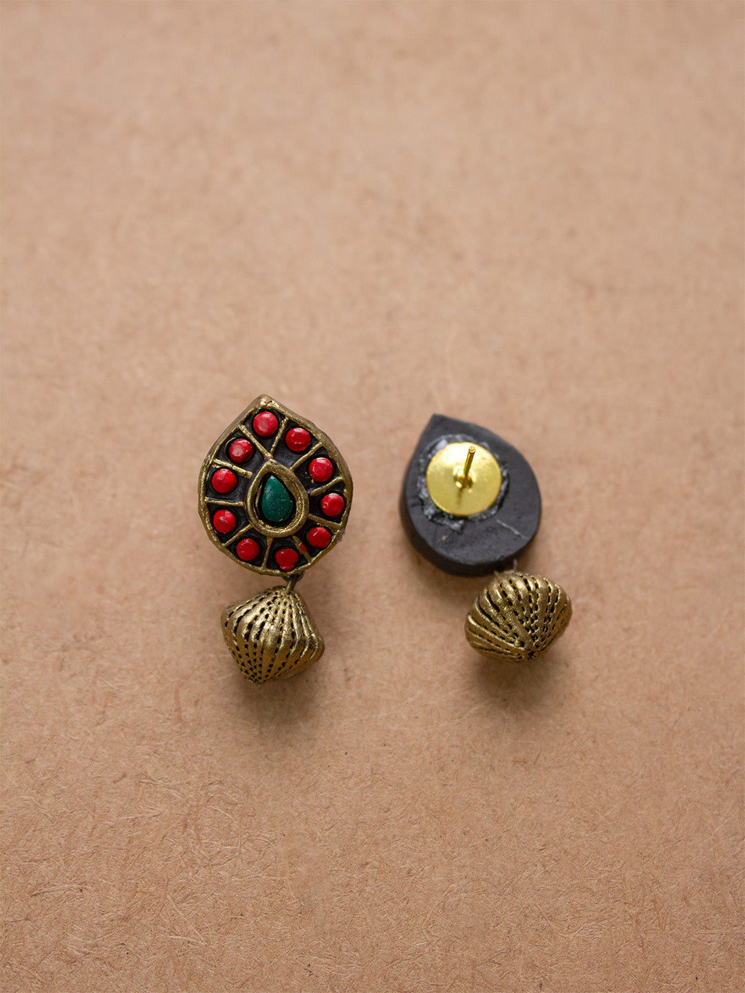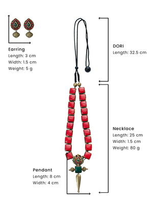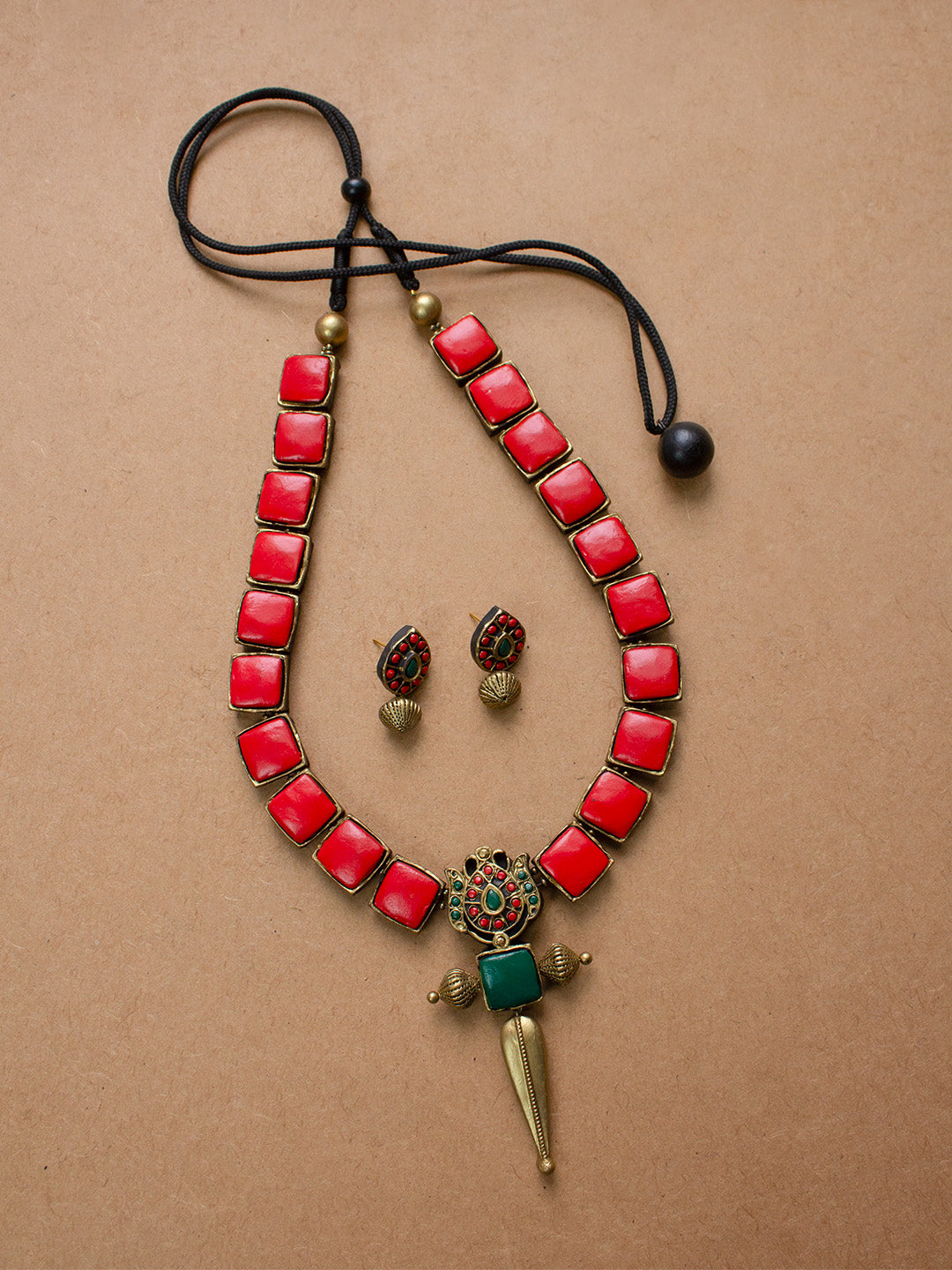 Chaturika — Red Green Square Design Handmade Terracotta Necklace Set