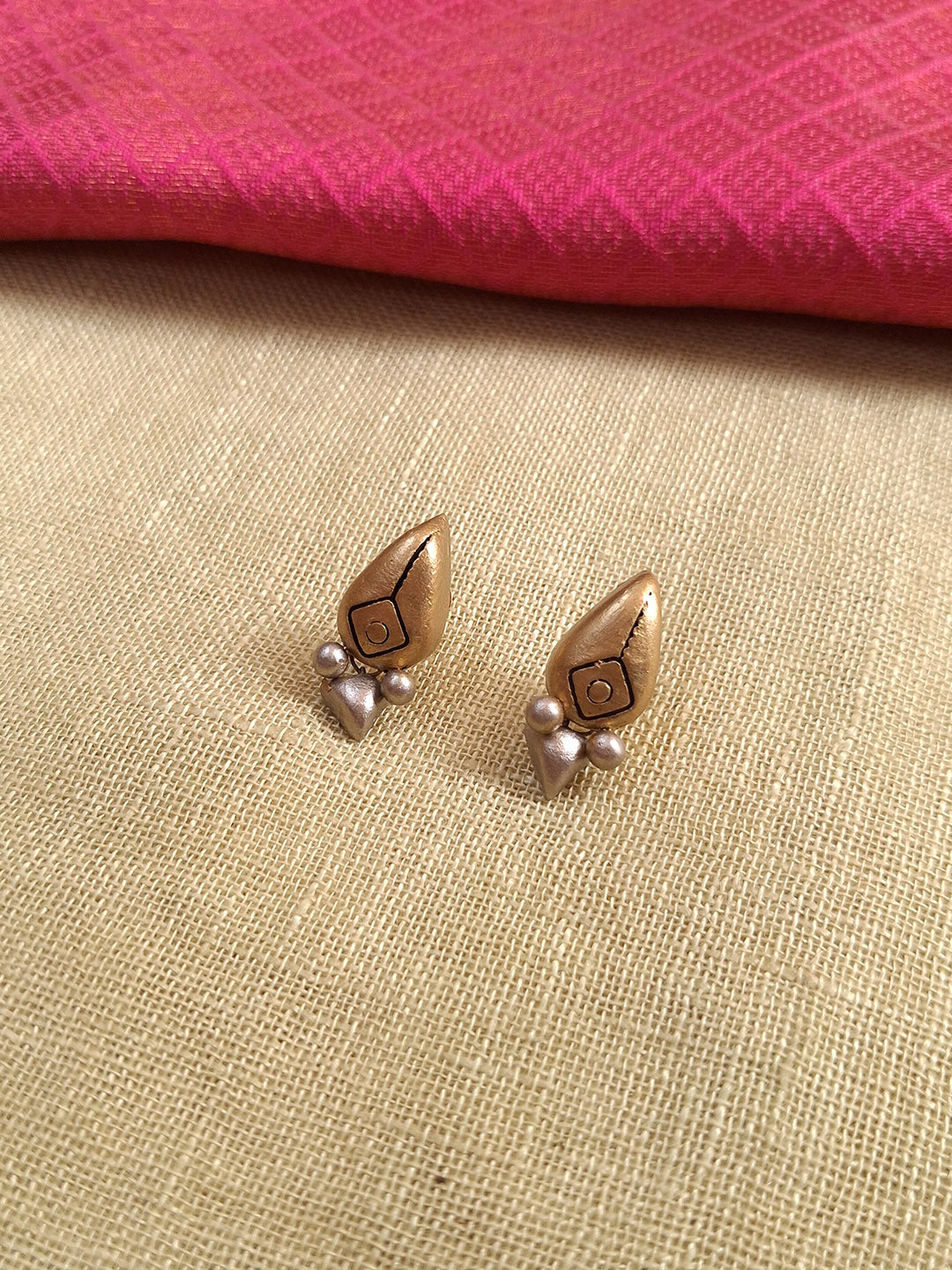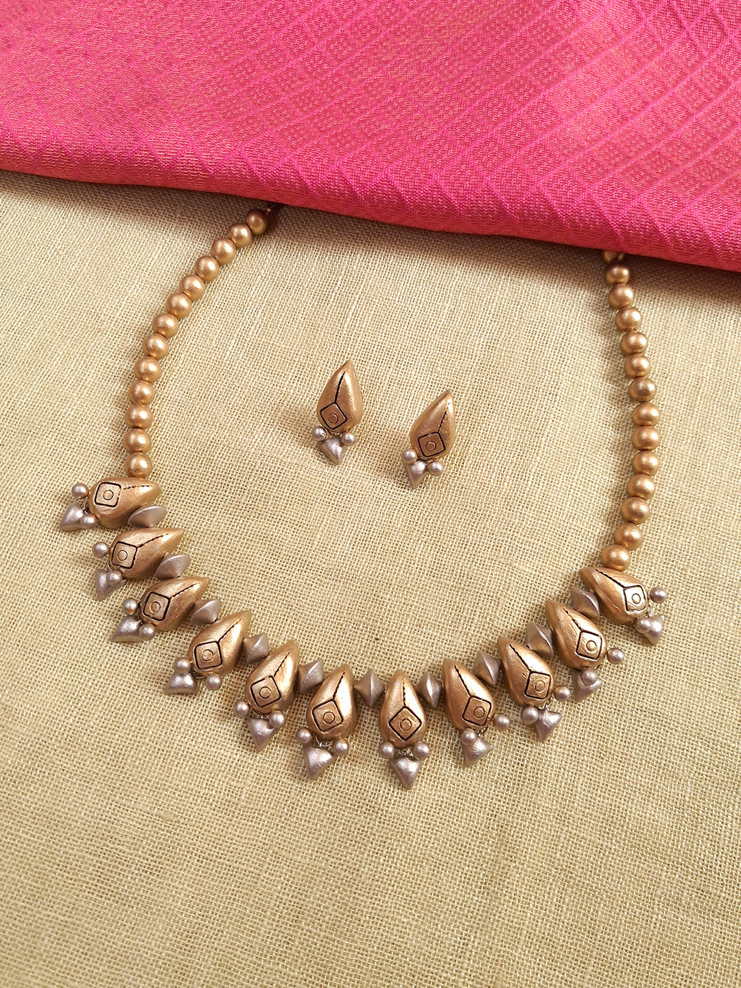 Shilpakriti – Handmade Terracotta Leaf Motif Necklace Set with Matte Gold Beads and Pearl Drops