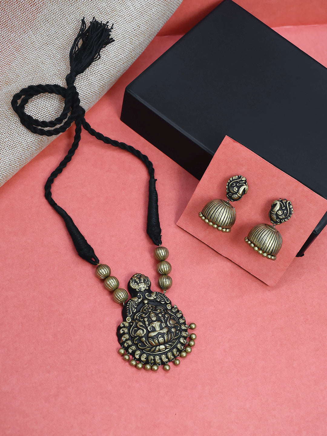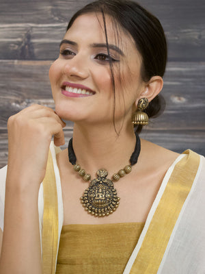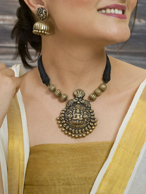 Shreesutra — Designer Handmade Gold Plated Lakshmi Design Pendant Choker Handmade Terracotta Necklace Set - Kantara