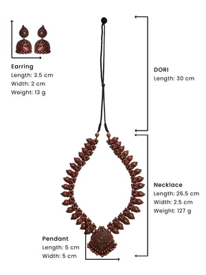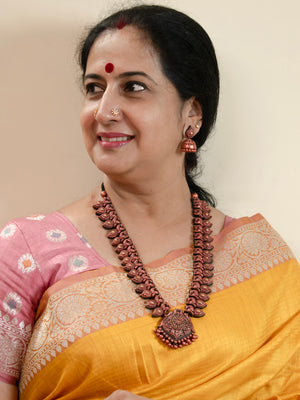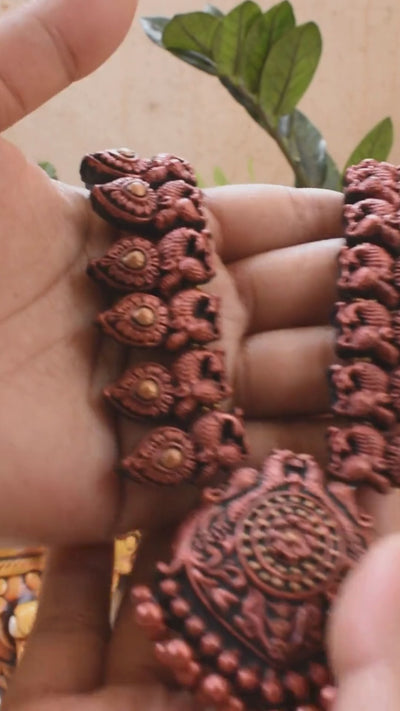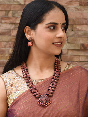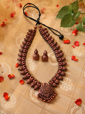 Tamramayura — Copper Finish Grand Peacock Design Haram Handmade Terracotta Necklace Set - Kantara