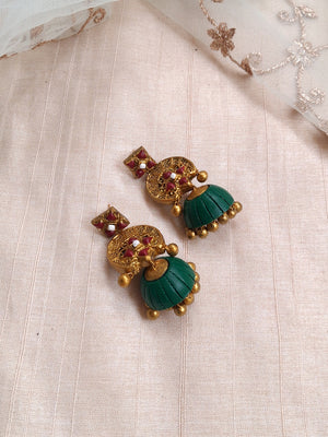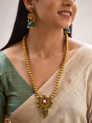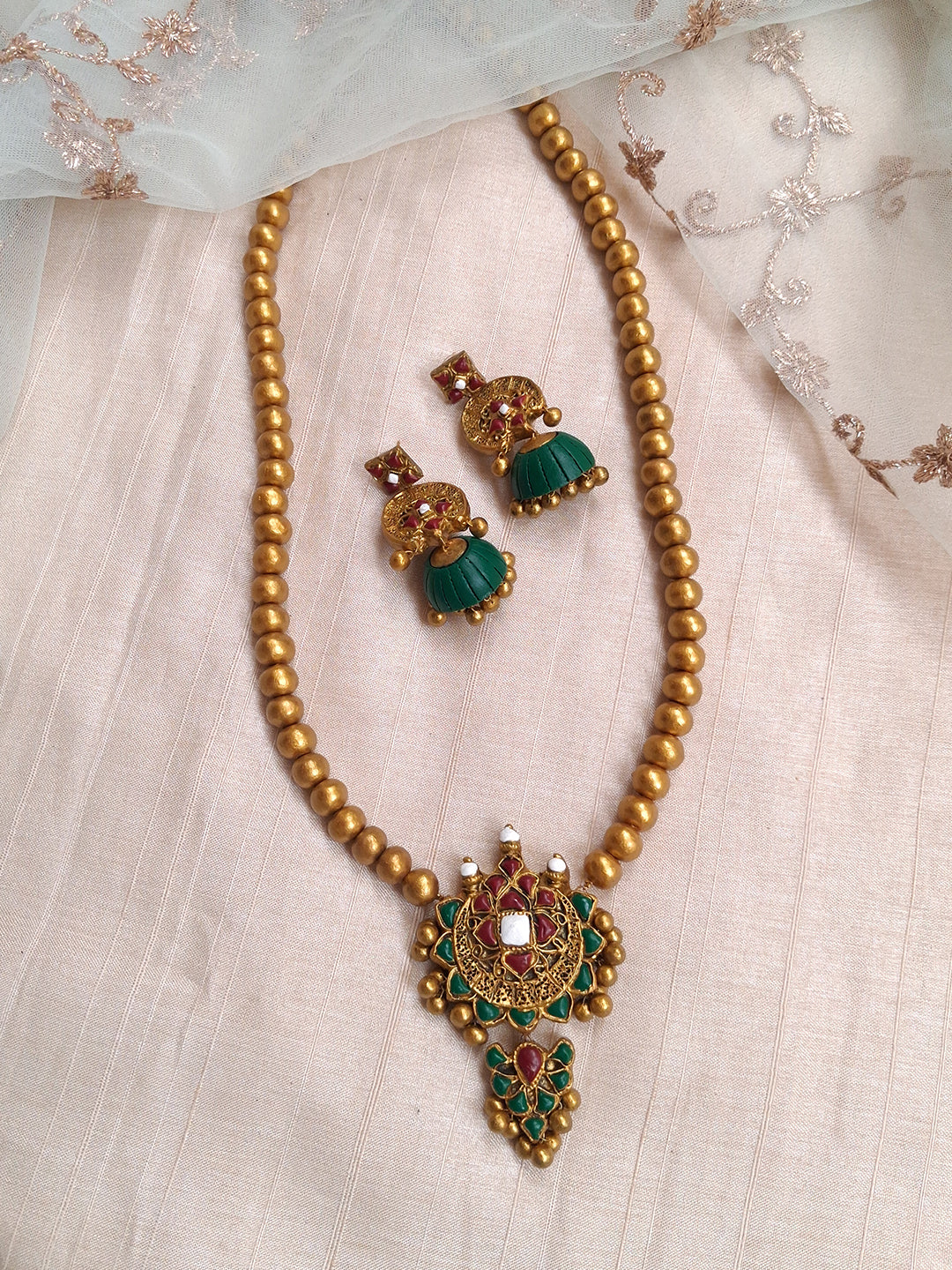 Terracotta Antique Gold Bead Necklace with Floral Statement Pendant & Green Jhumka Earrings