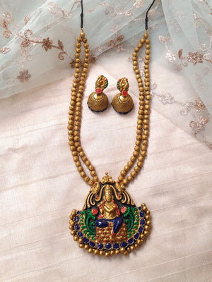 Terracotta Antique Gold Temple Gopalkrishna Pendant Necklace with Double Bead Chain & Jhumka Earrings